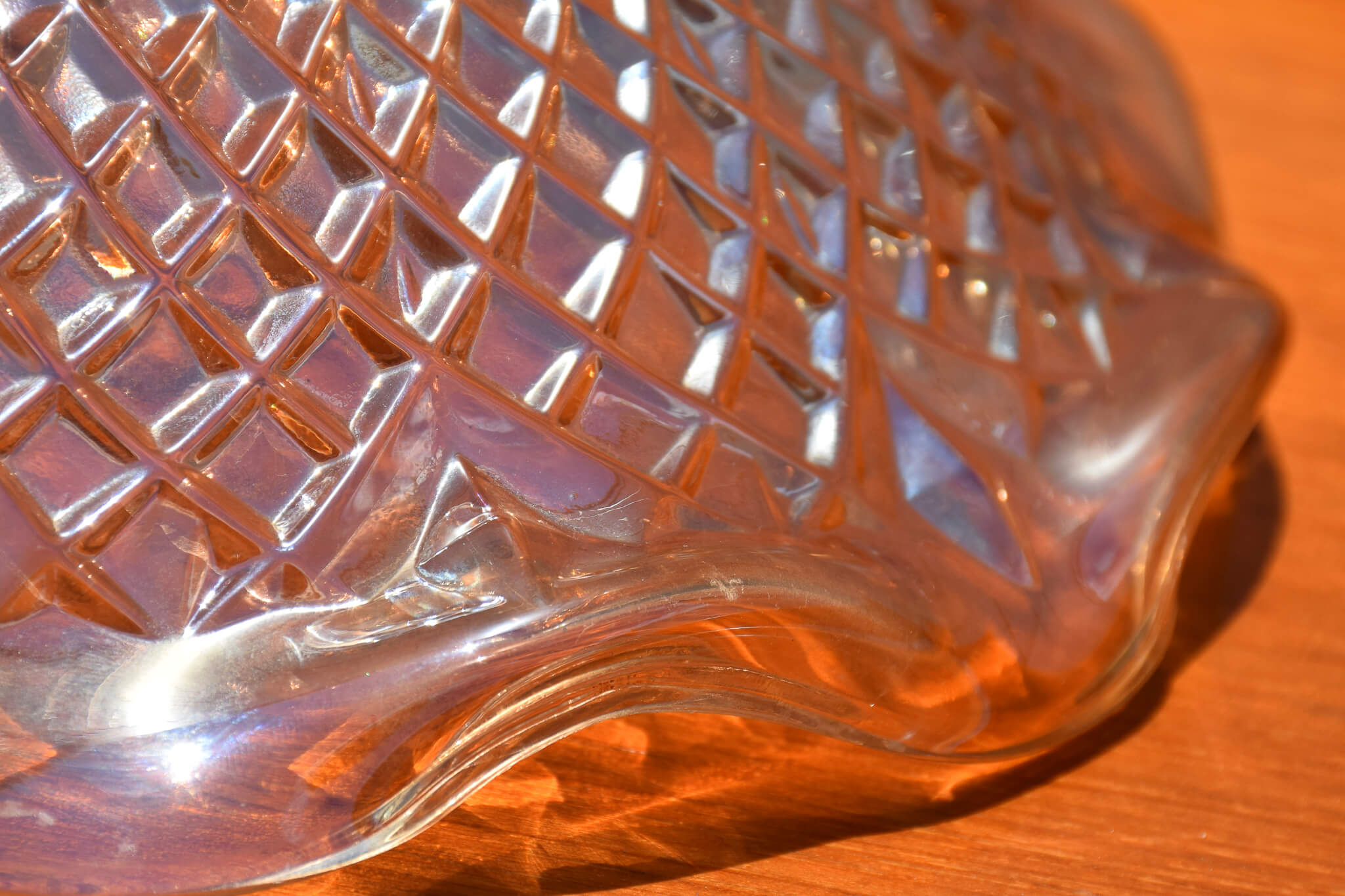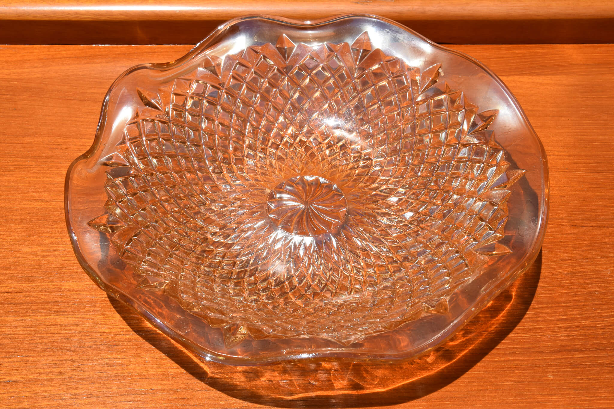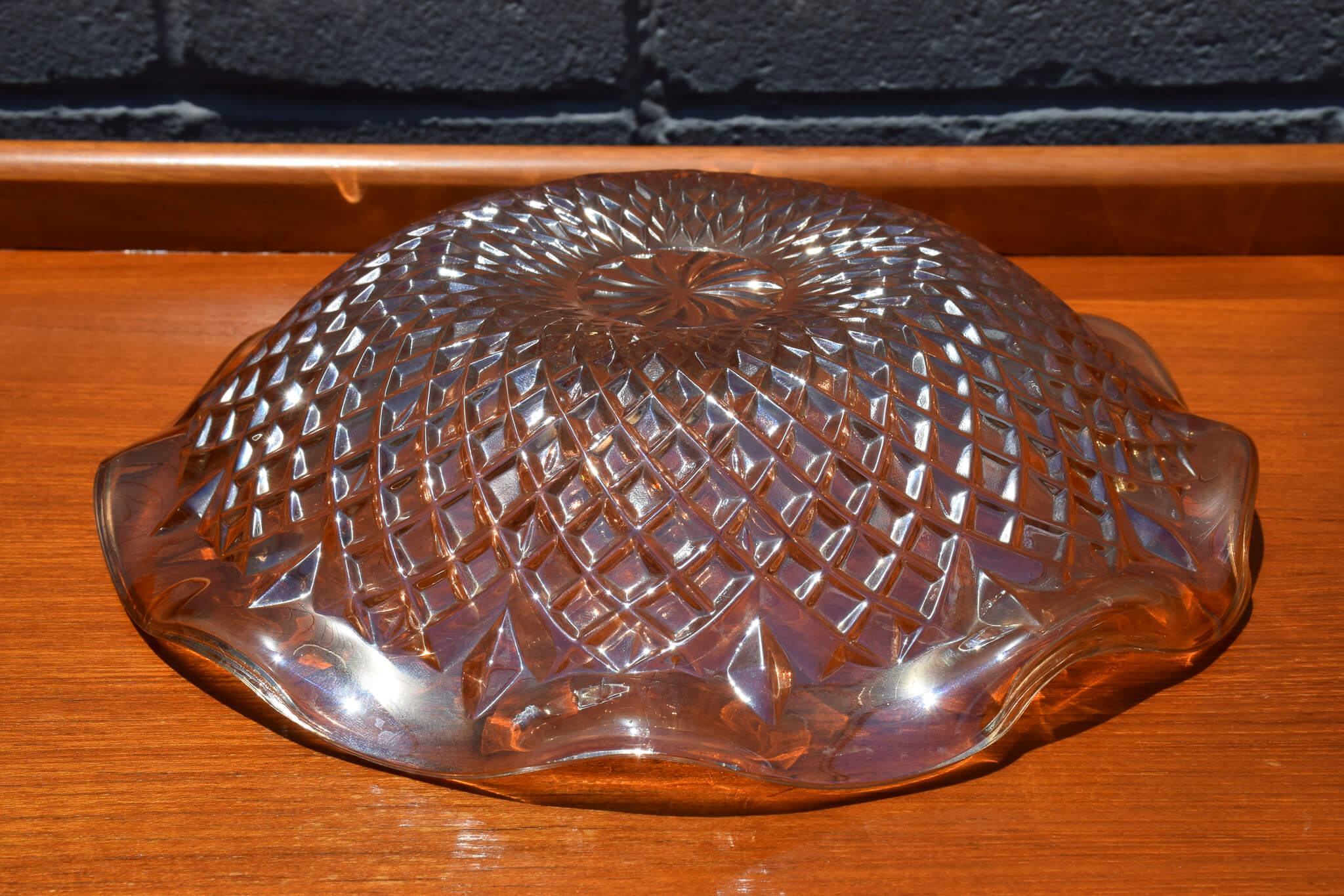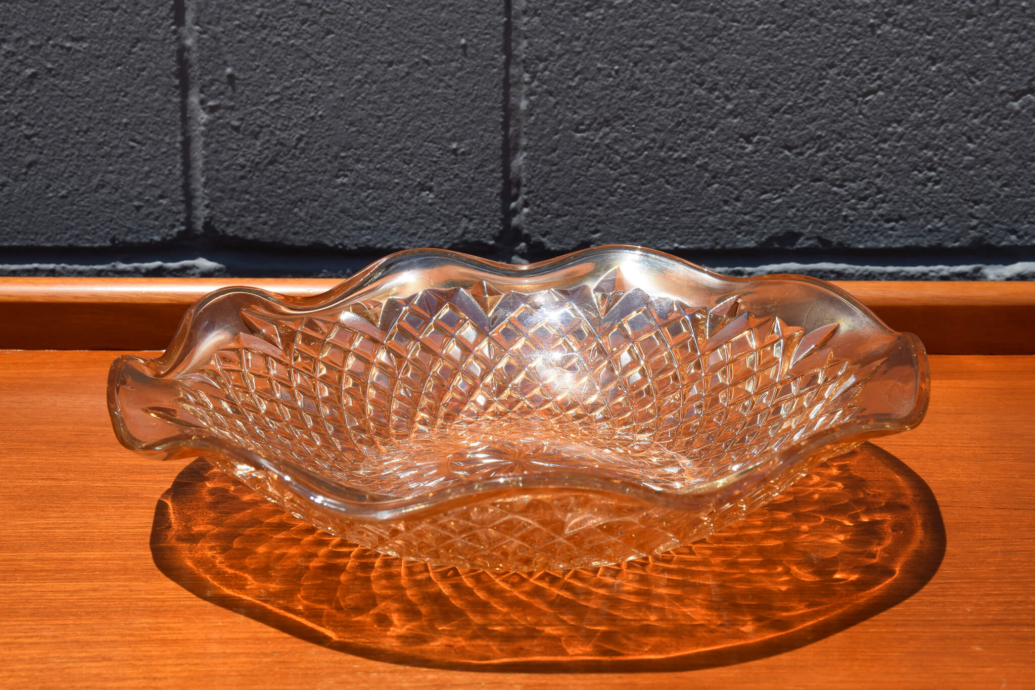 Unique and art deco in style, this stunning iridescent marigold coloured bold with diamond print and ruffled edges would make a great addition to any home decor.