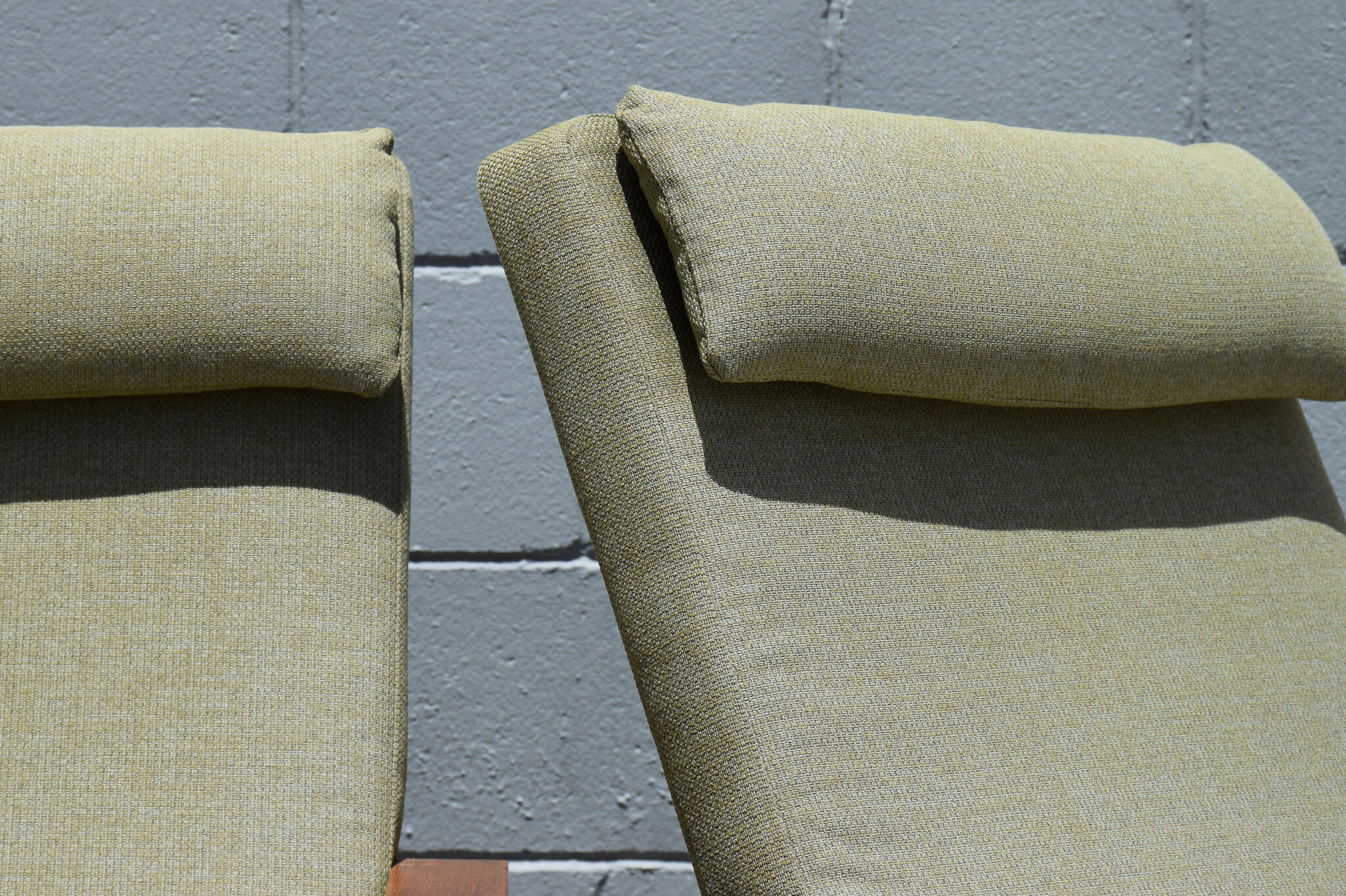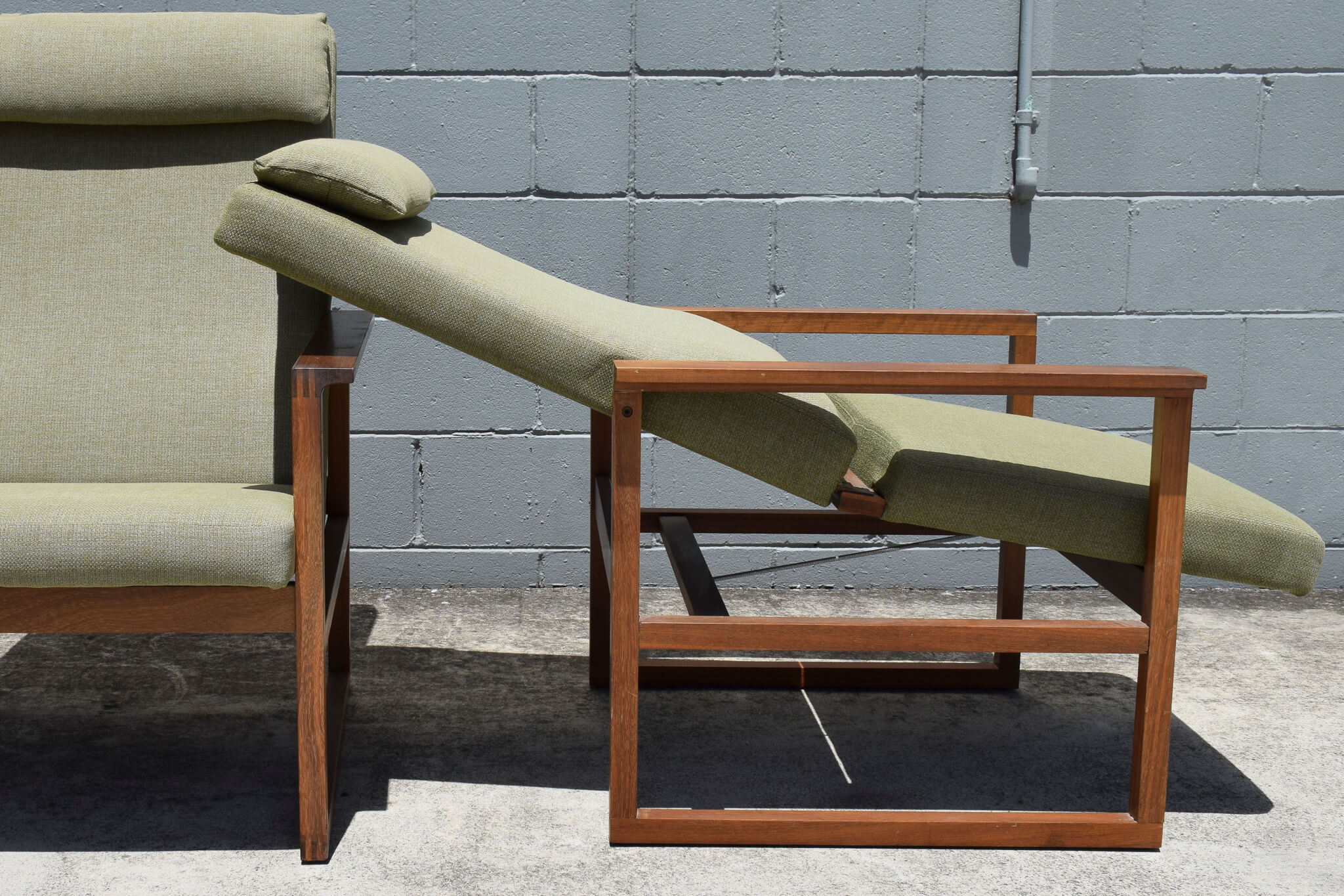 Produced for Petersen’s accountant in the 1960s, these custom pieces are reclinable with finger joints, featuring Mogensen’s signature balance of clean lines and soft curves. The beautiful mint green fabric is in lovely condition and both chairs recline smoothly.