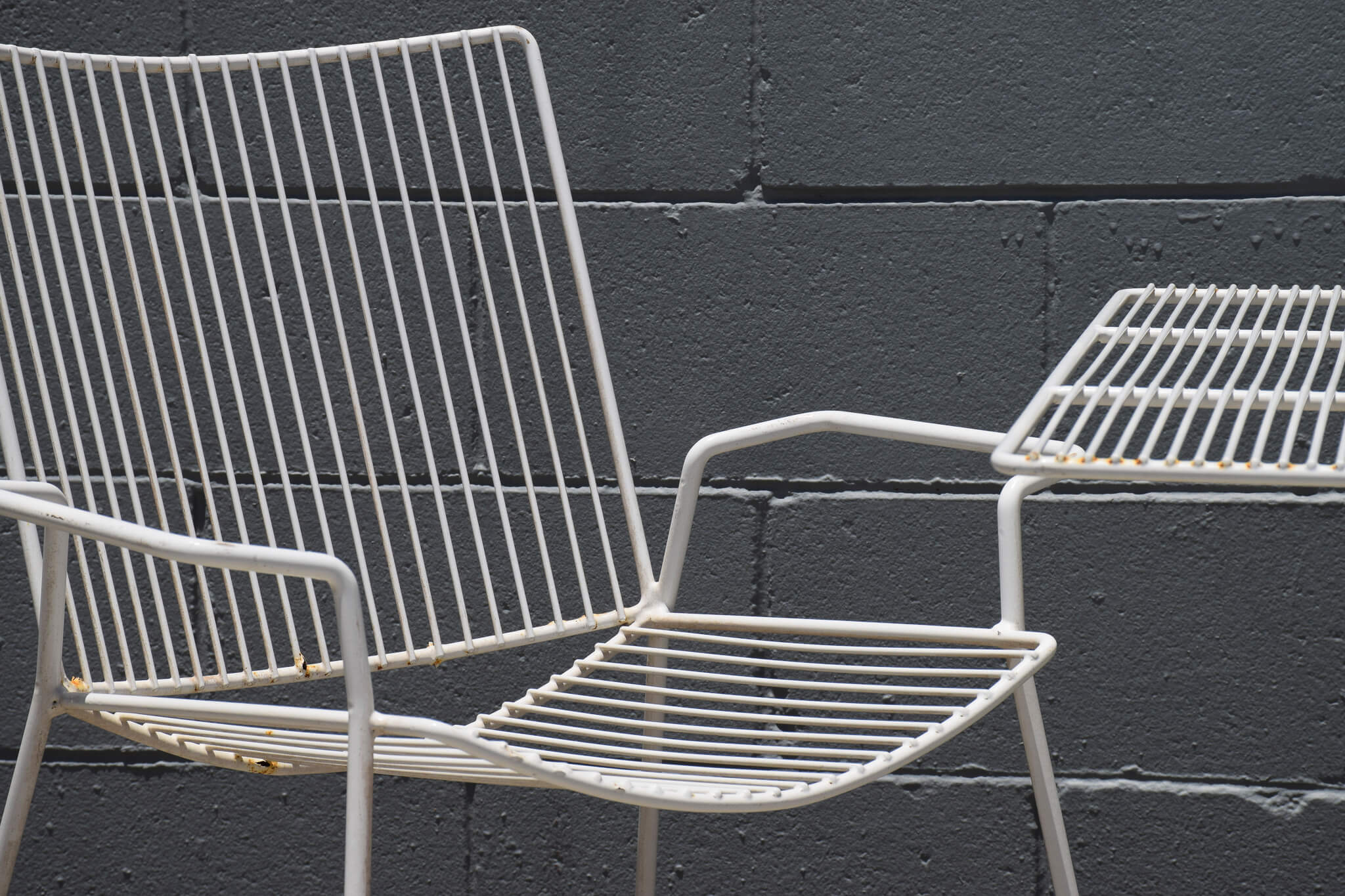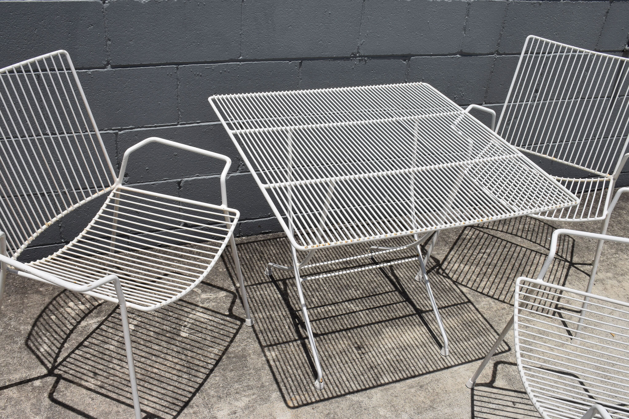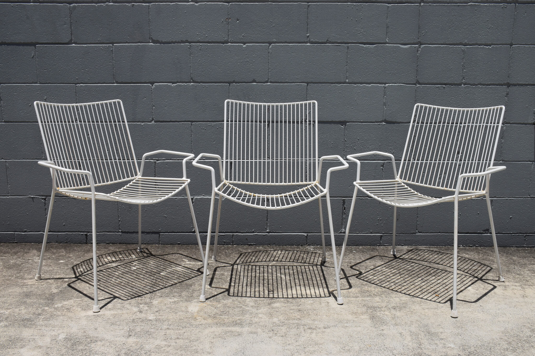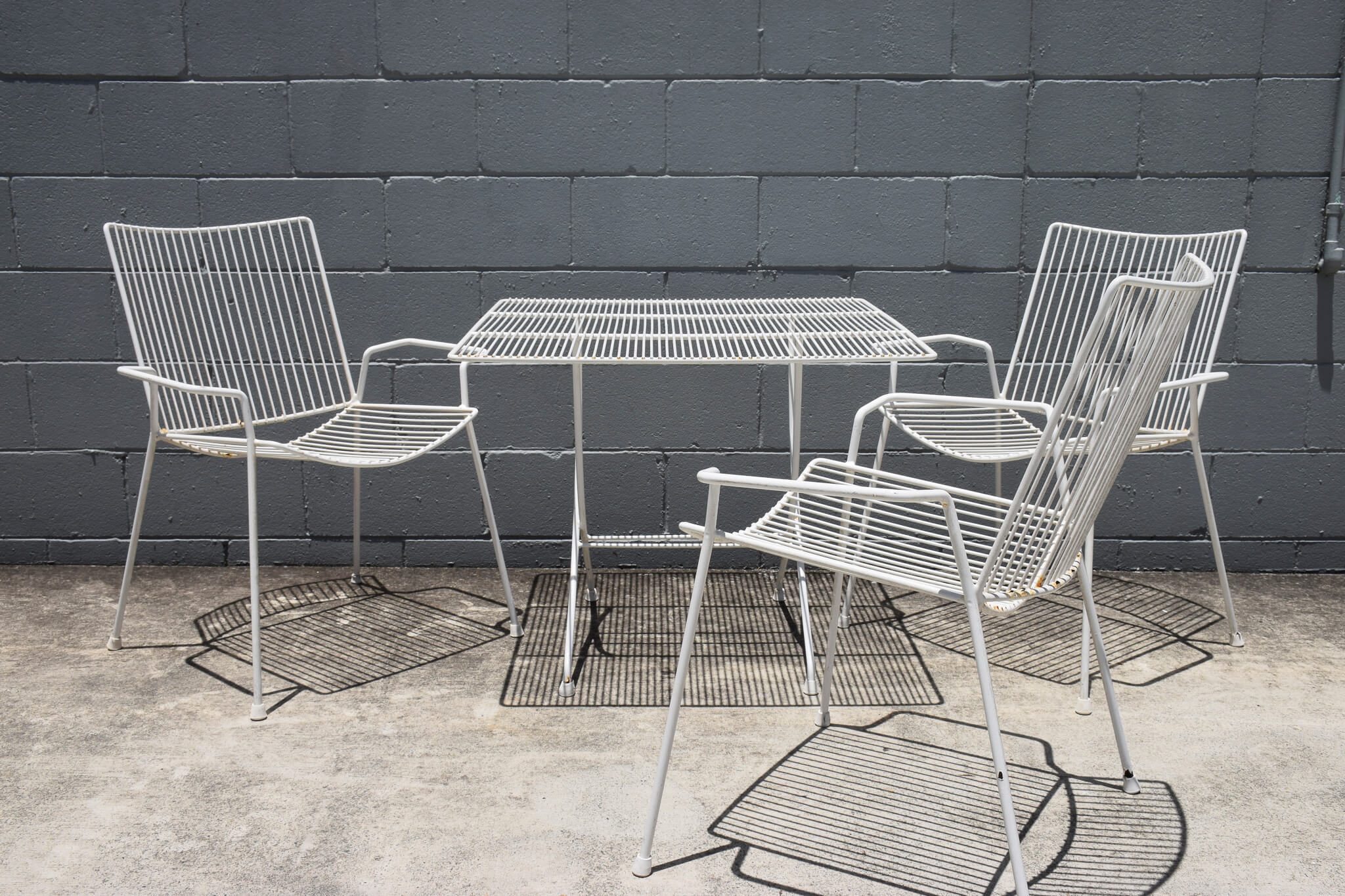 This setting includes 3 chairs and a large square table. All in original condition, powder-coated white with some signs of wear and rust per the images.