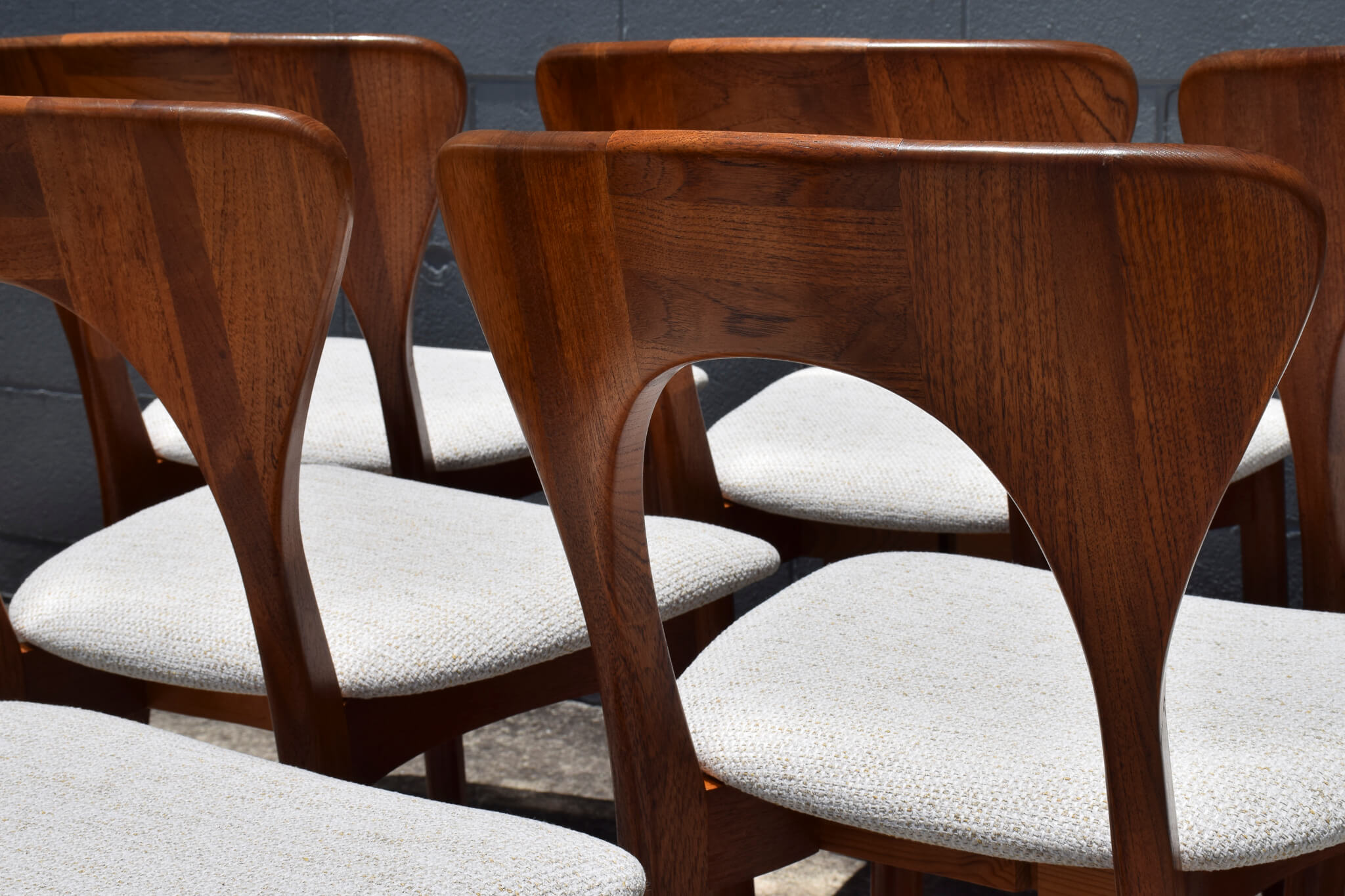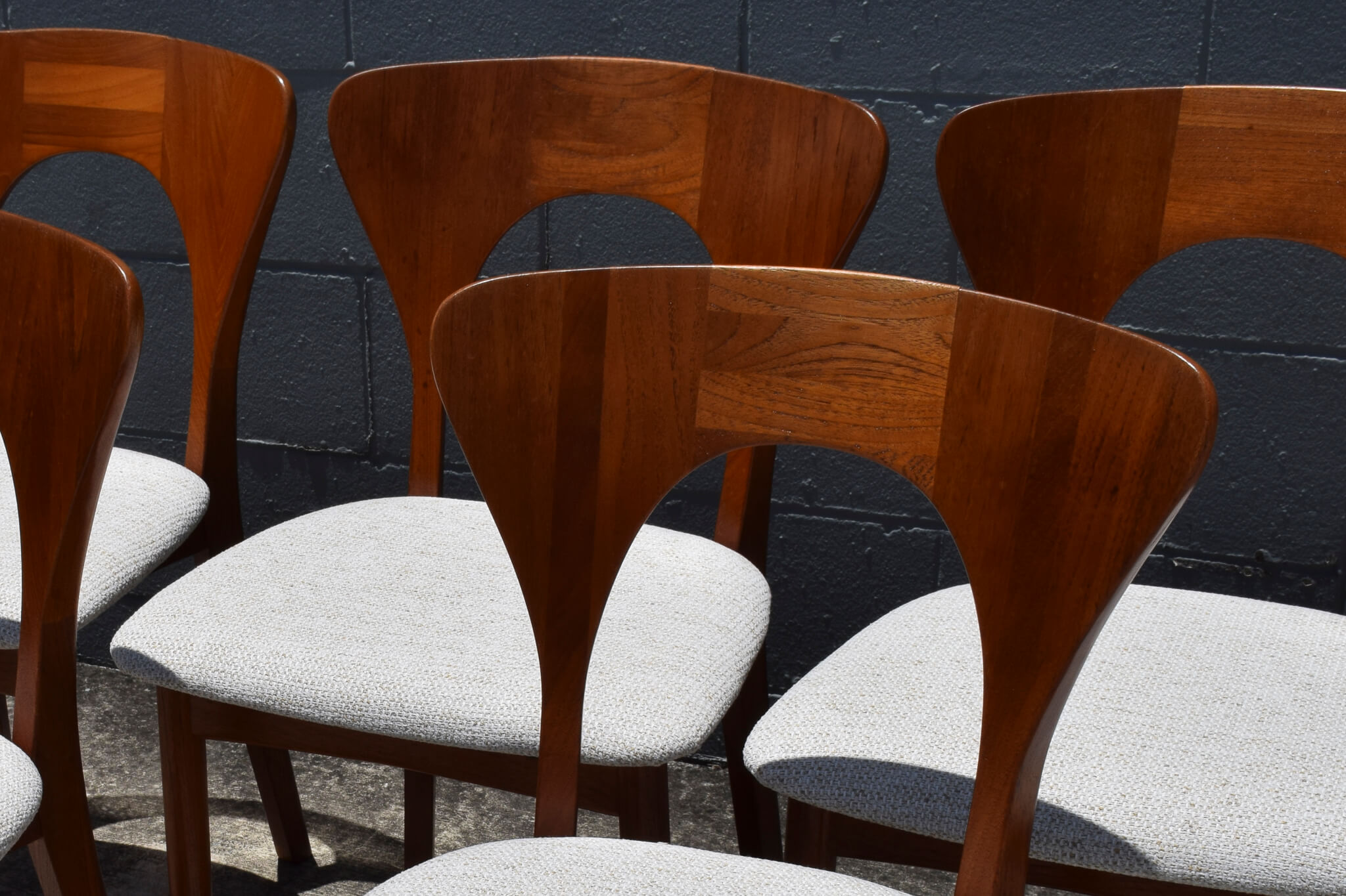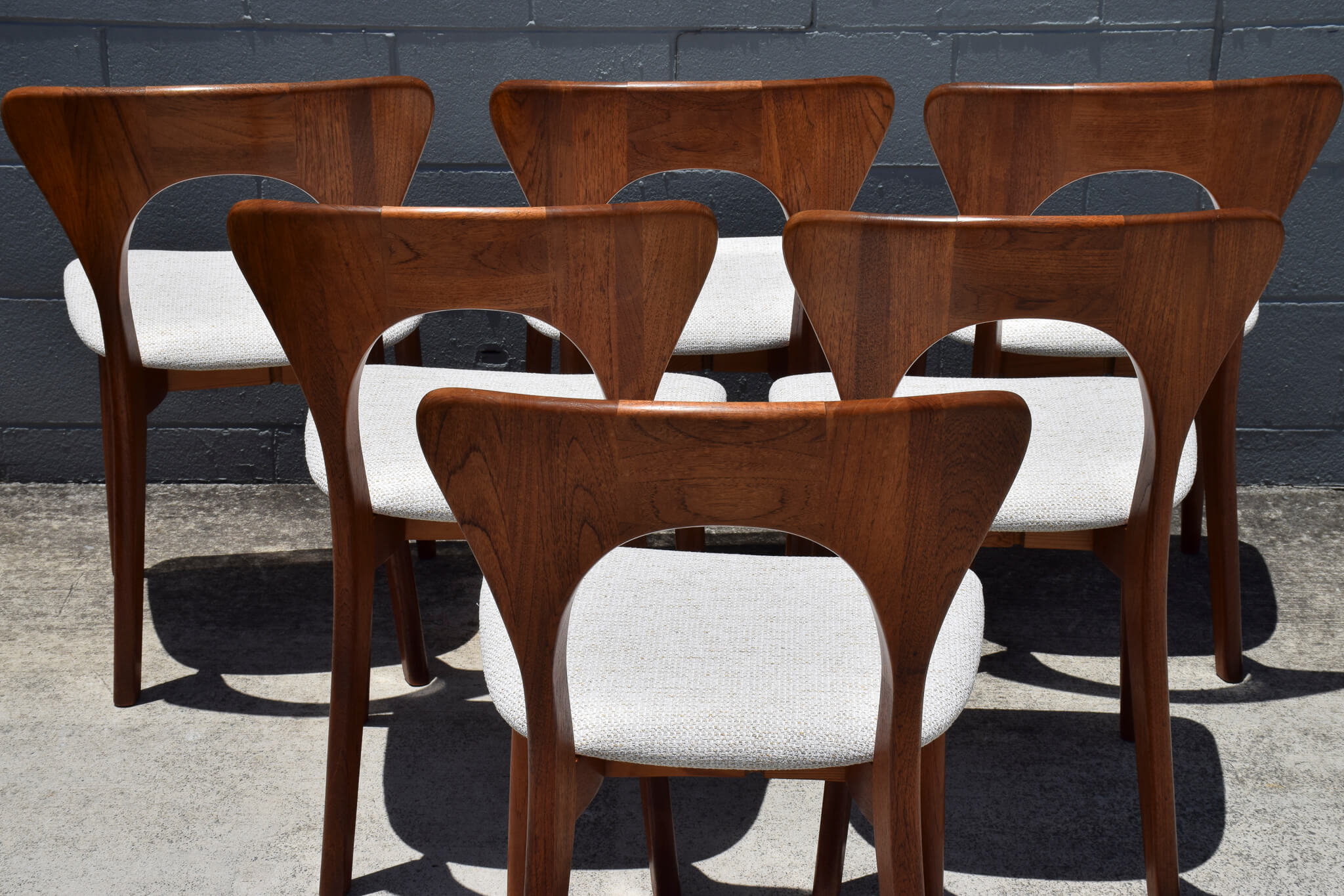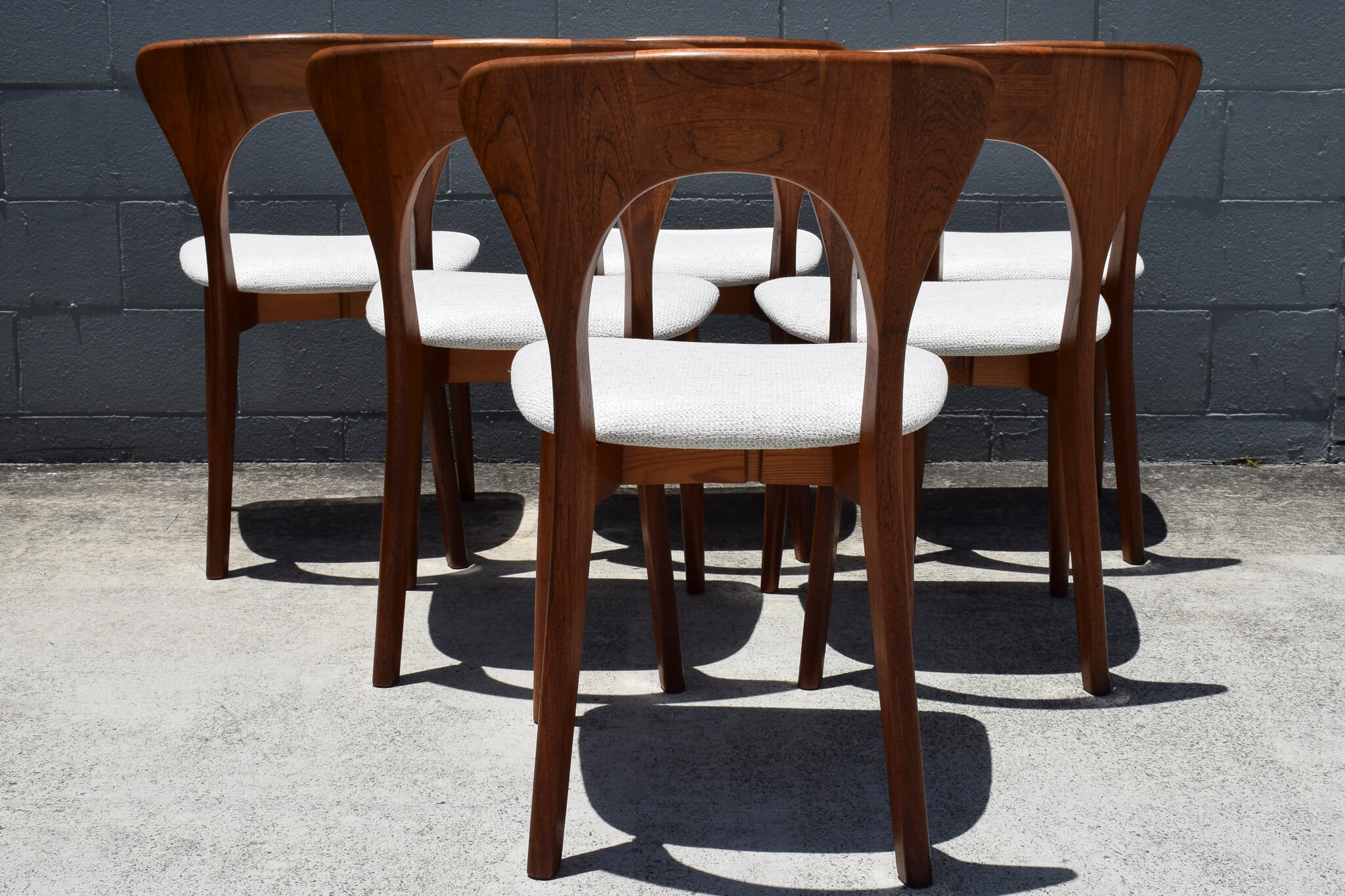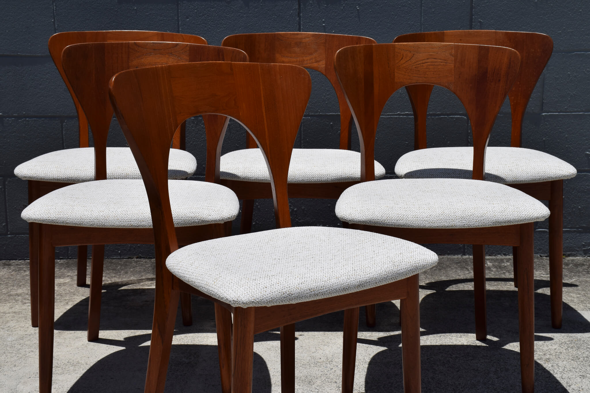 A very rare set to find in Australia and our first, this stunning set of 6 teak dining chairs were designed and produced by renowned Danish maker Niels Koefoed.