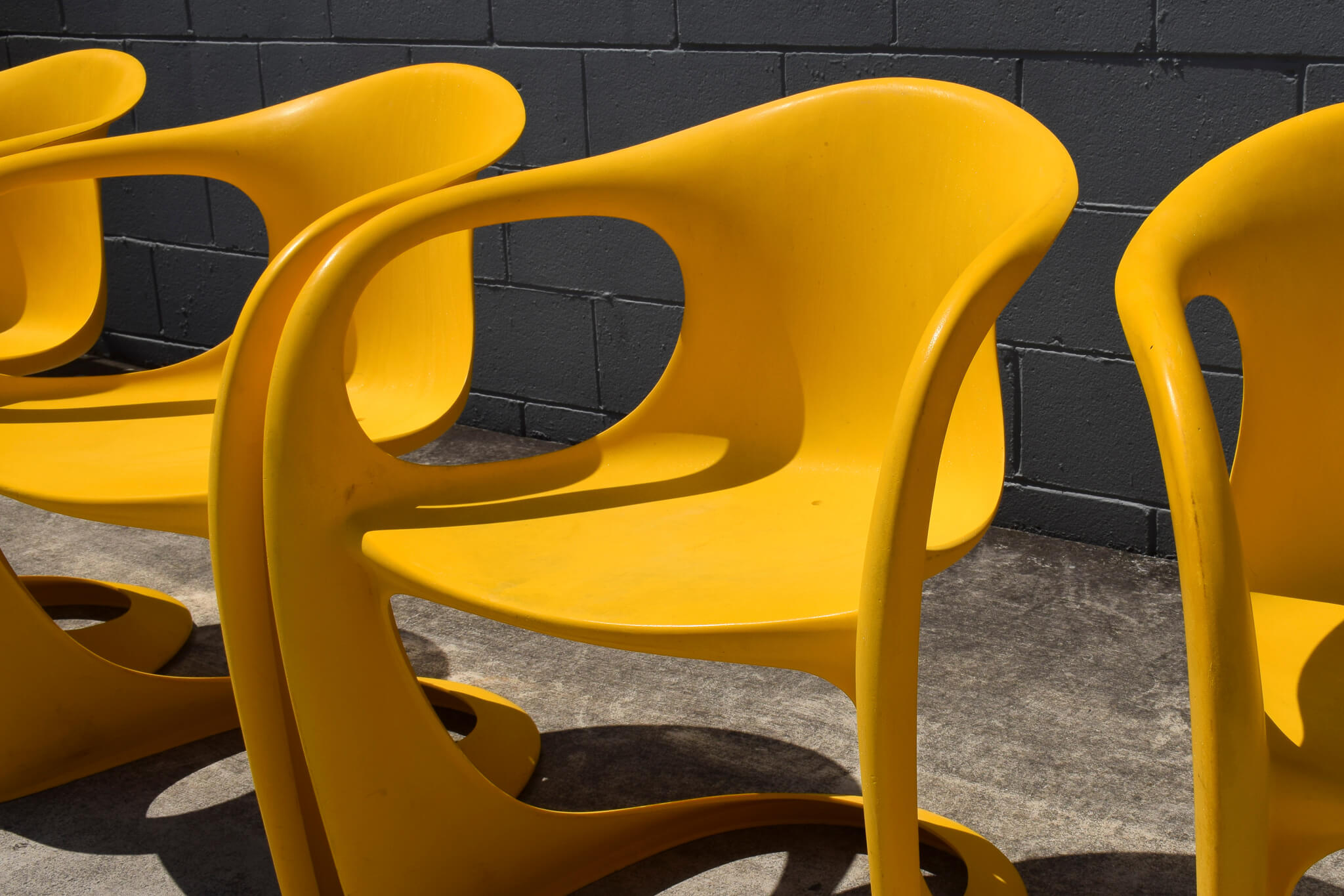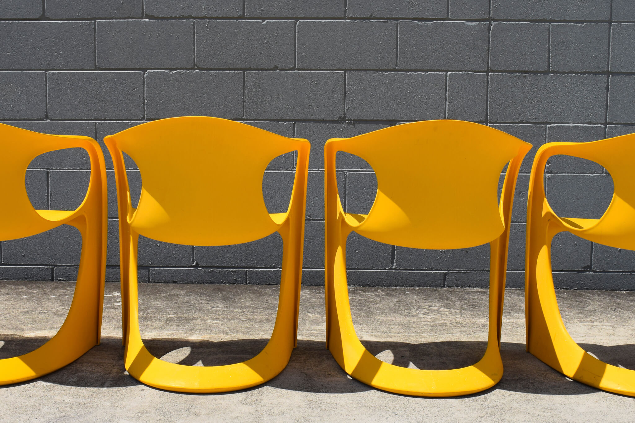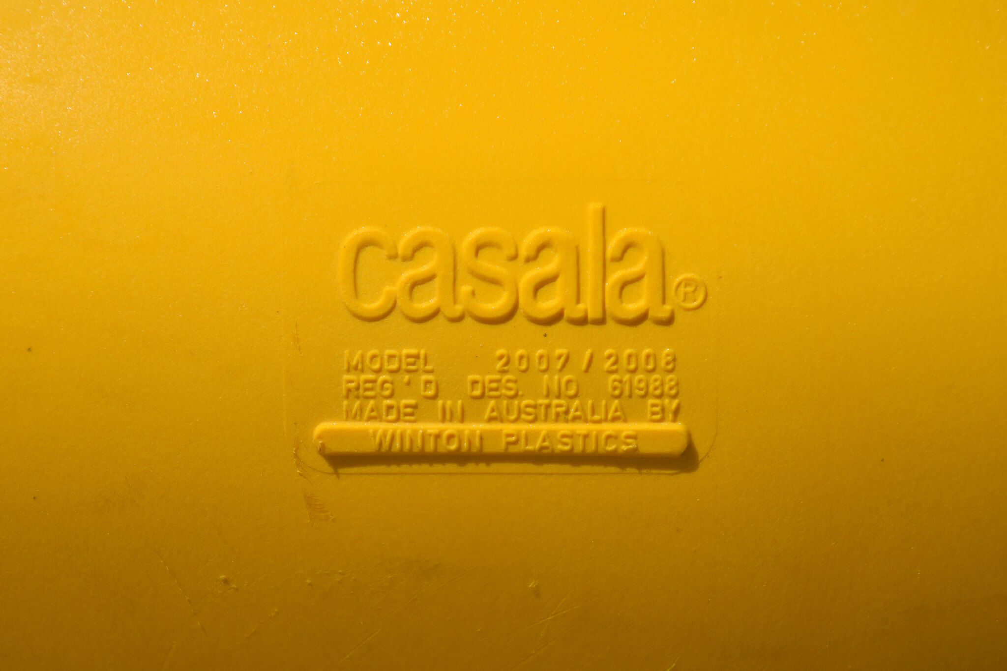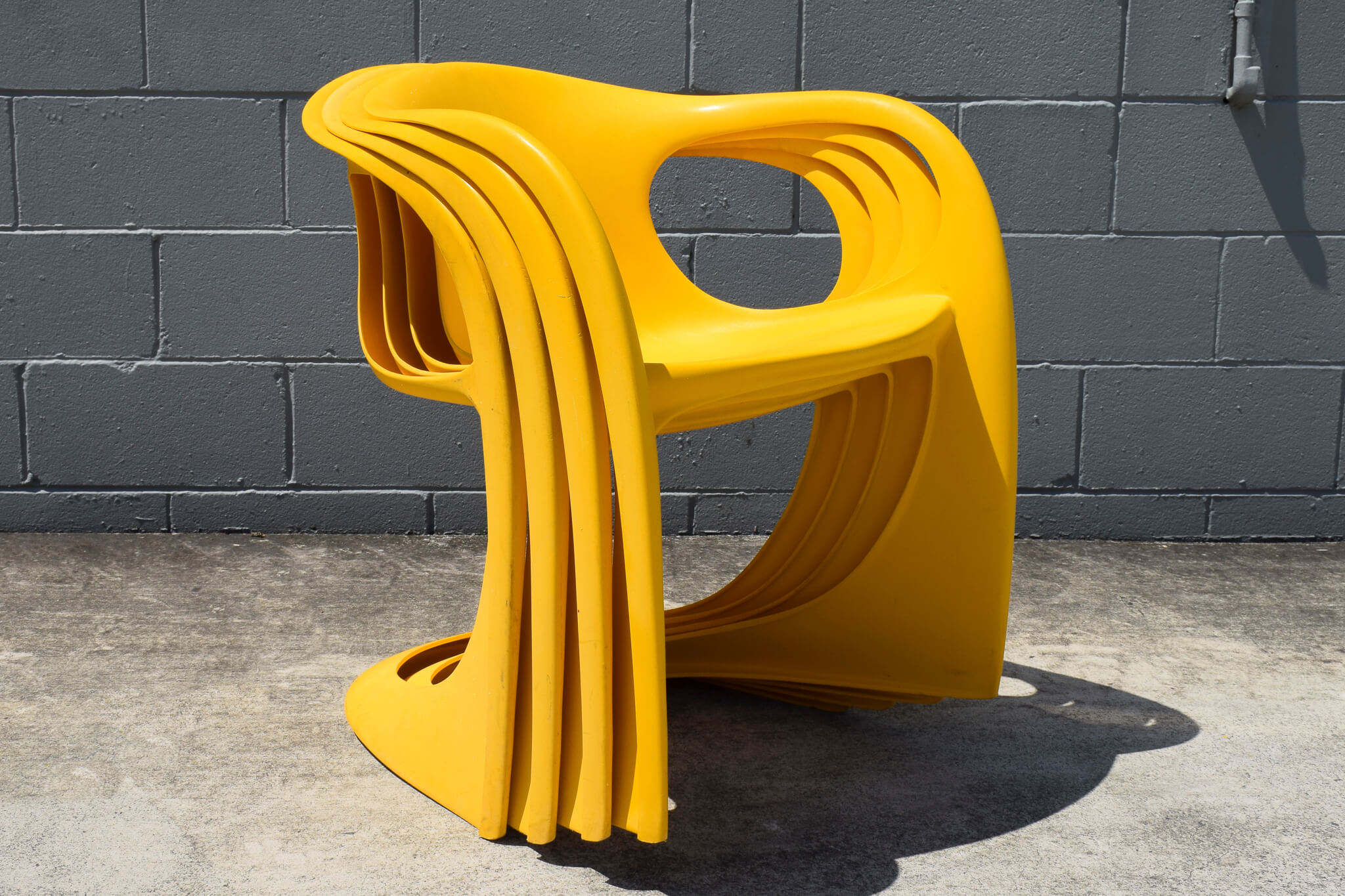 Original yellow coloured stacking Casalino outdoor chairs from the 1970s by Casala. Made in Australia by Winton Plastics, both chairs easily stack on top of each other for easy transporting or storing.