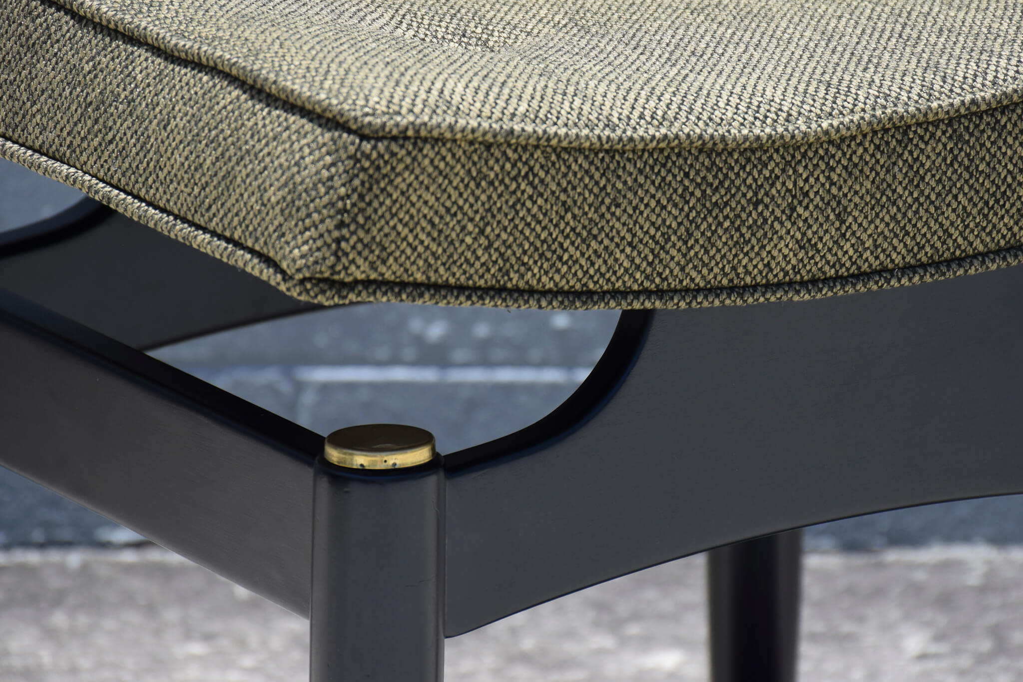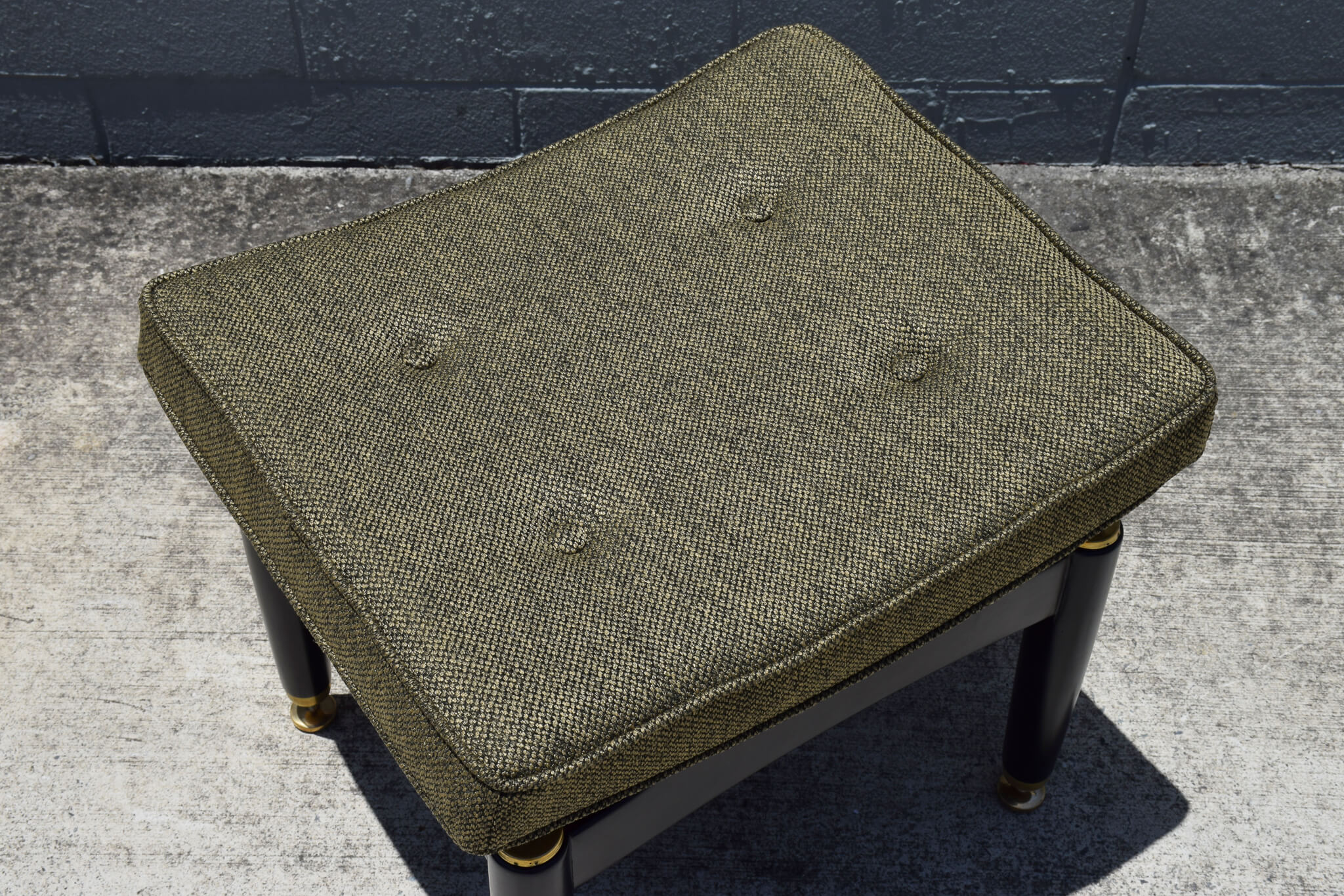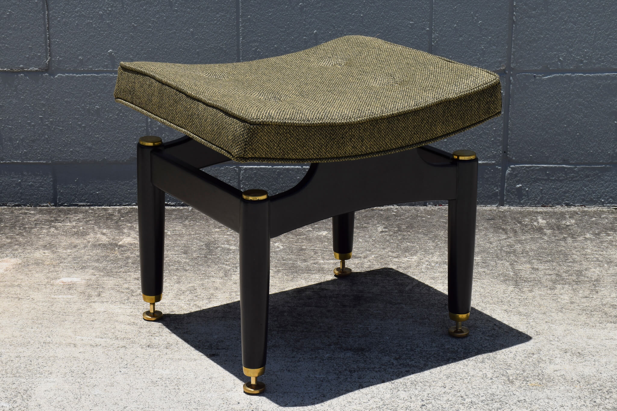 Featuring a unique floating style seat, this stool has been fully restored to its former glory with fully restored black painted base and brass accents with brand new foam and upholstery in high quality Warwick Fabrics.
