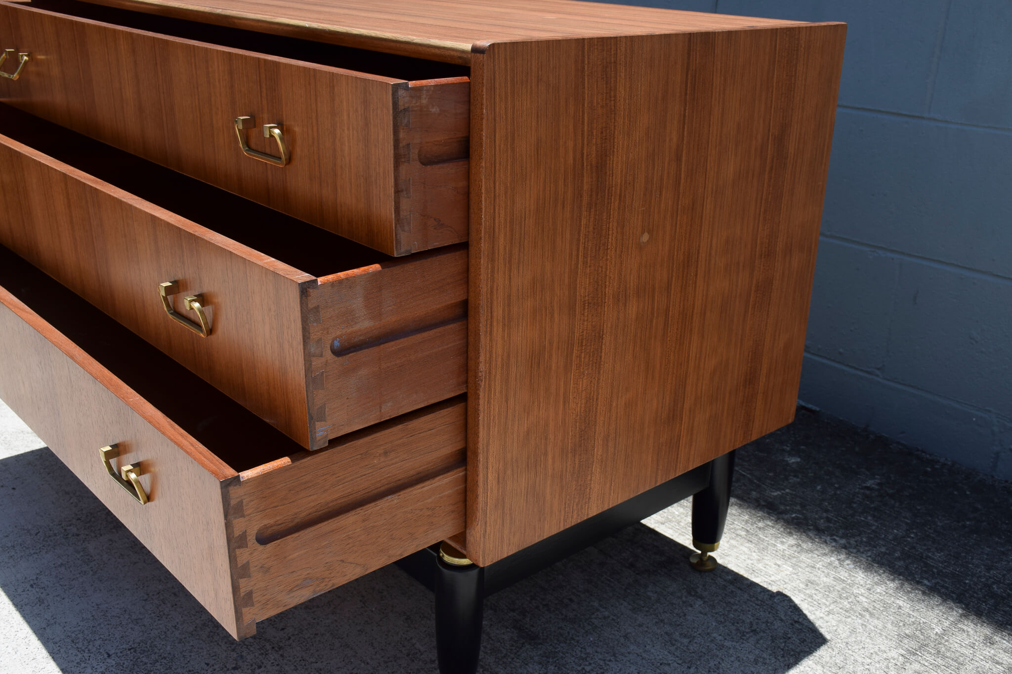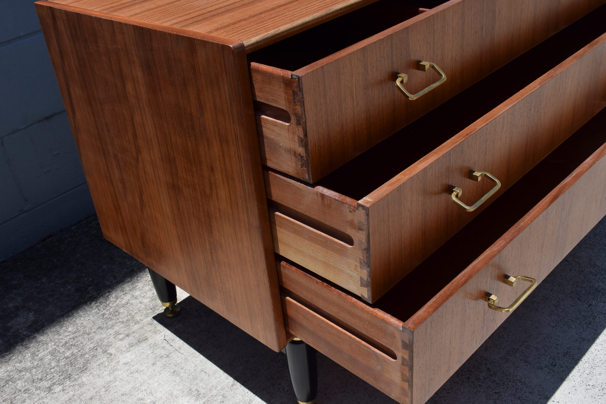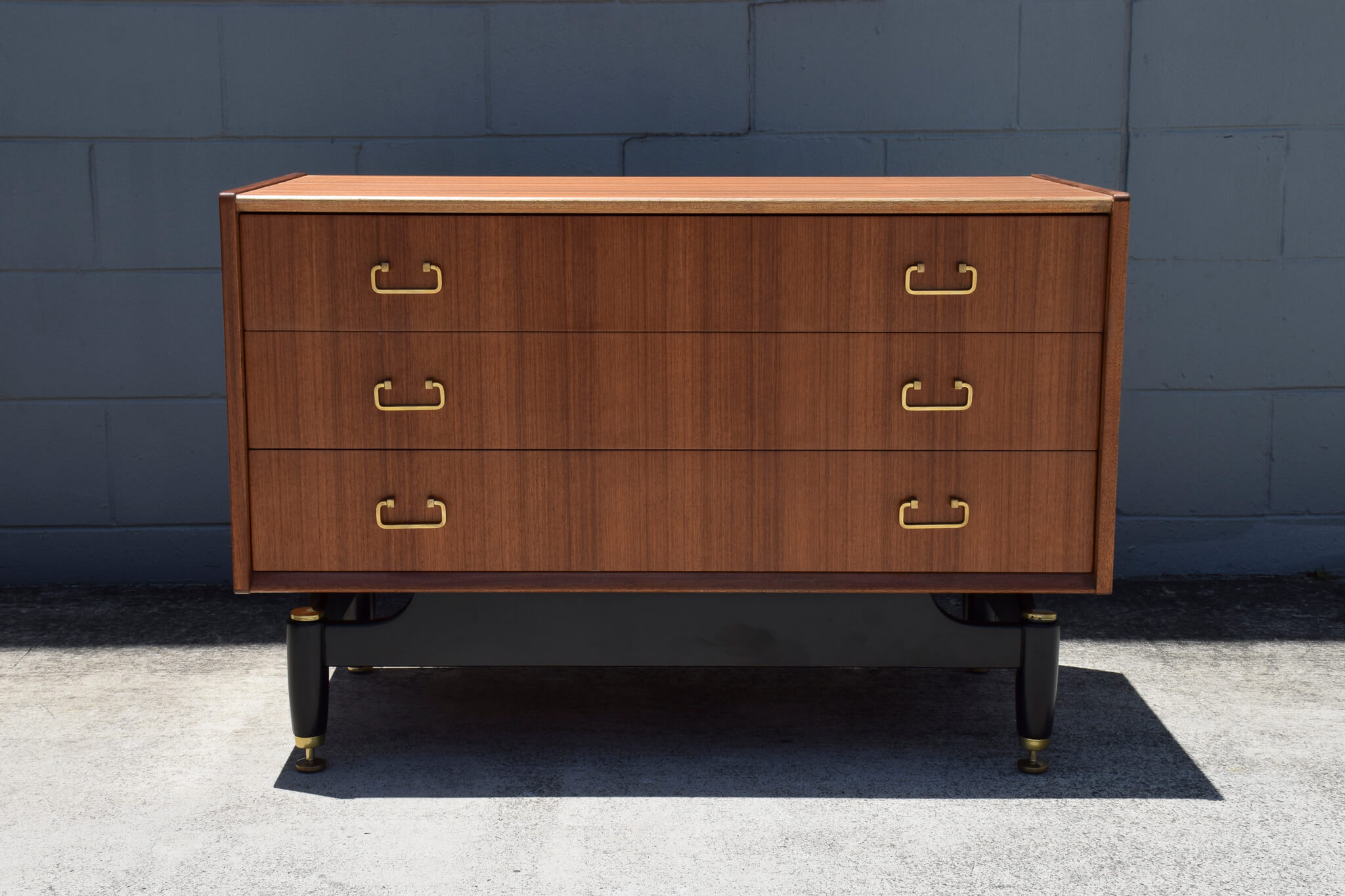 Made from Tola wood (African Timber) and featuring: 3 great sized drawers (one with removable timber separators), quality dovetail joinery, stunning brass handles and adjustable feet sitting on a fully restored black painted timber base.