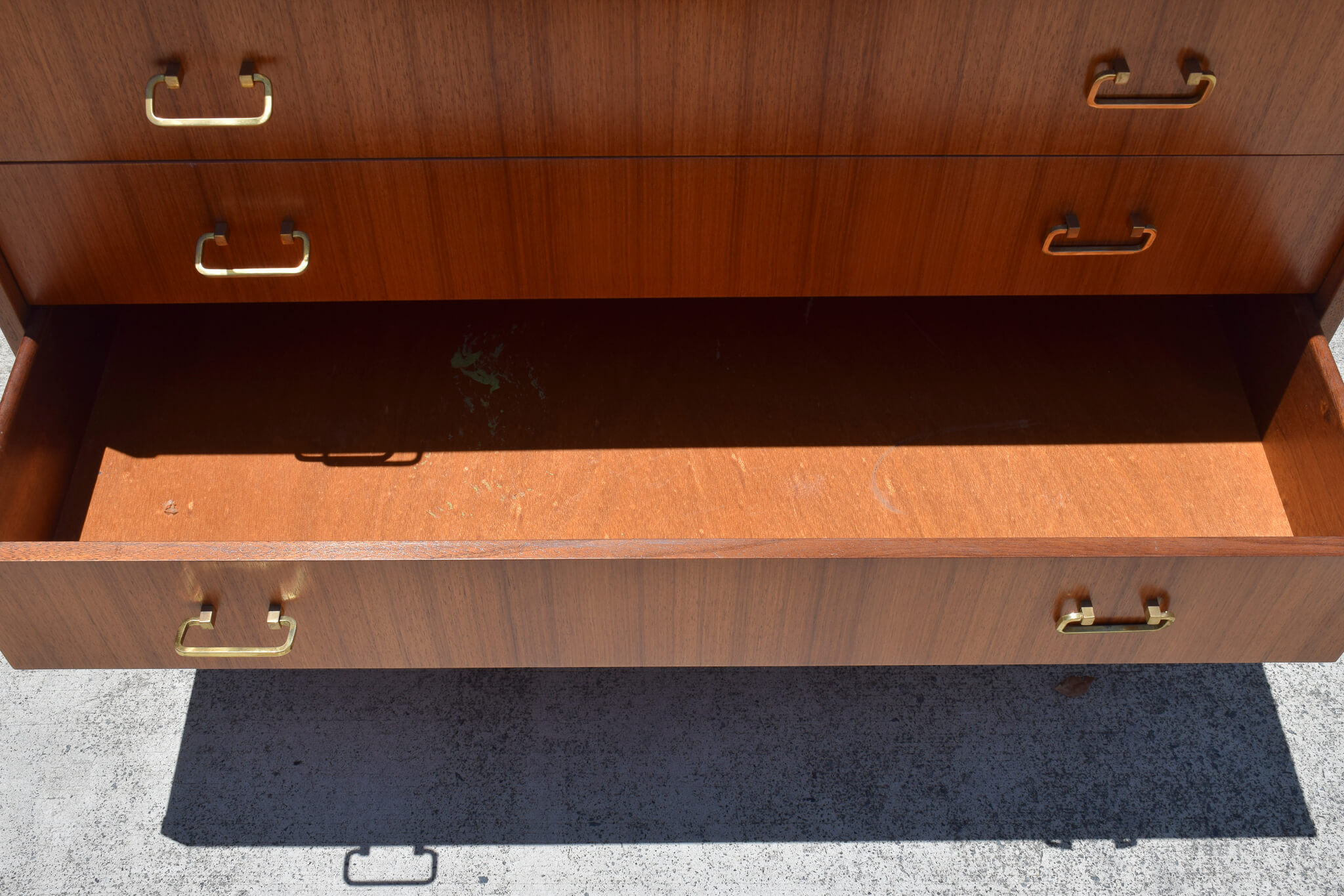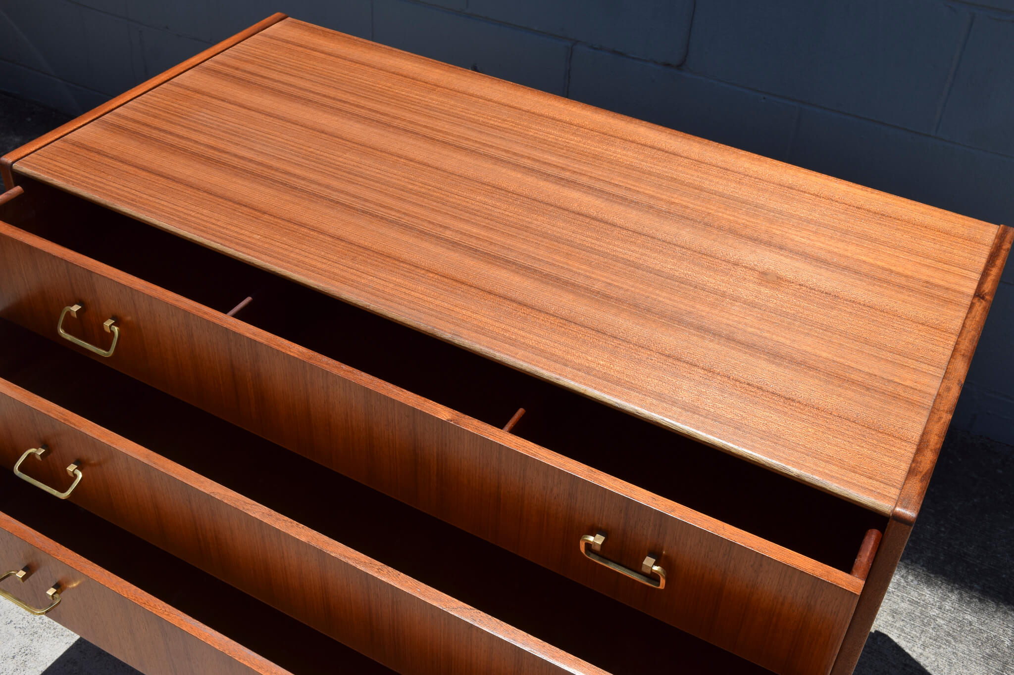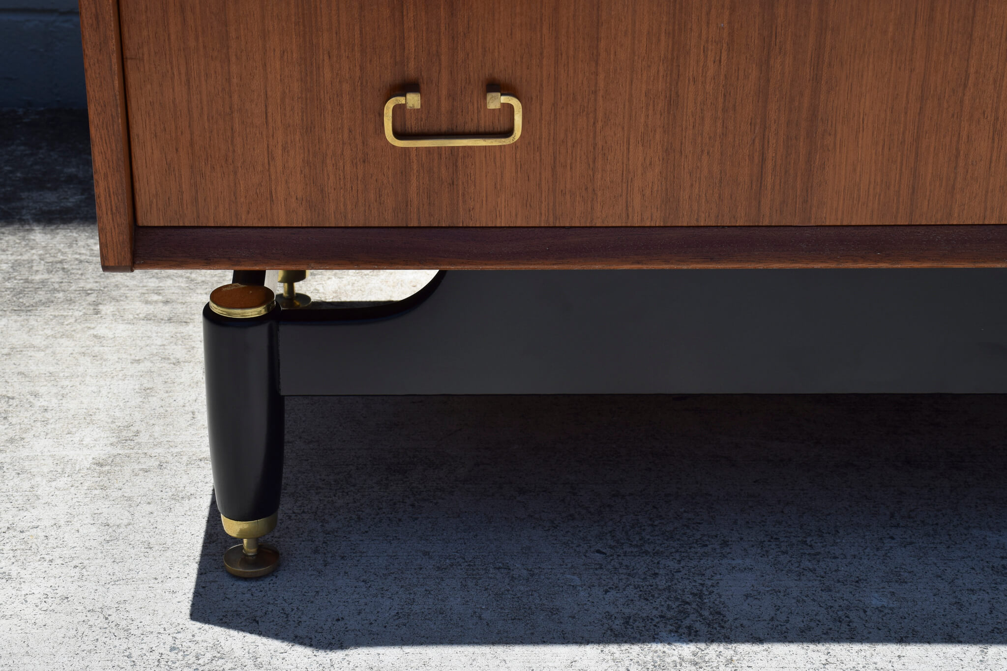 Made from Tola wood (African Timber) and featuring: 3 great sized drawers (one with removable timber separators), quality dovetail joinery, stunning brass handles and adjustable feet sitting on a fully restored black painted timber base.