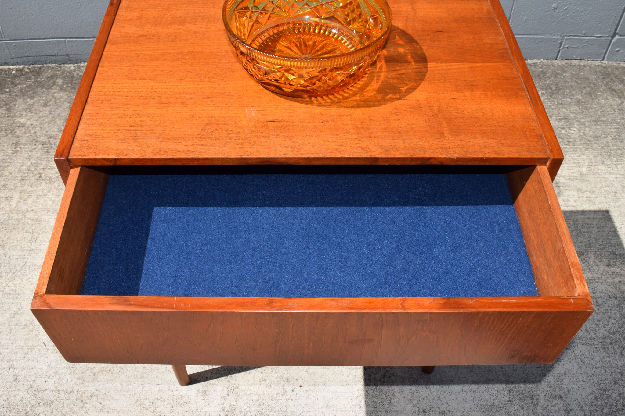 In great condition, it features one perfectly sliding drawer and rattan shelf. The table top has been restored and the whole piece has been finished in Danish oil.