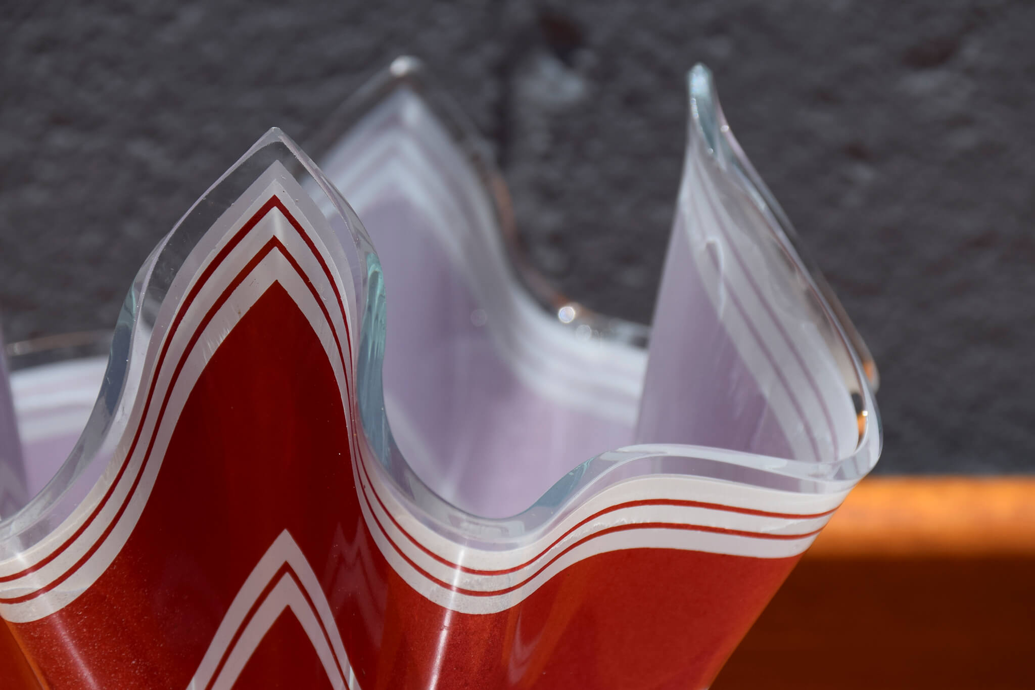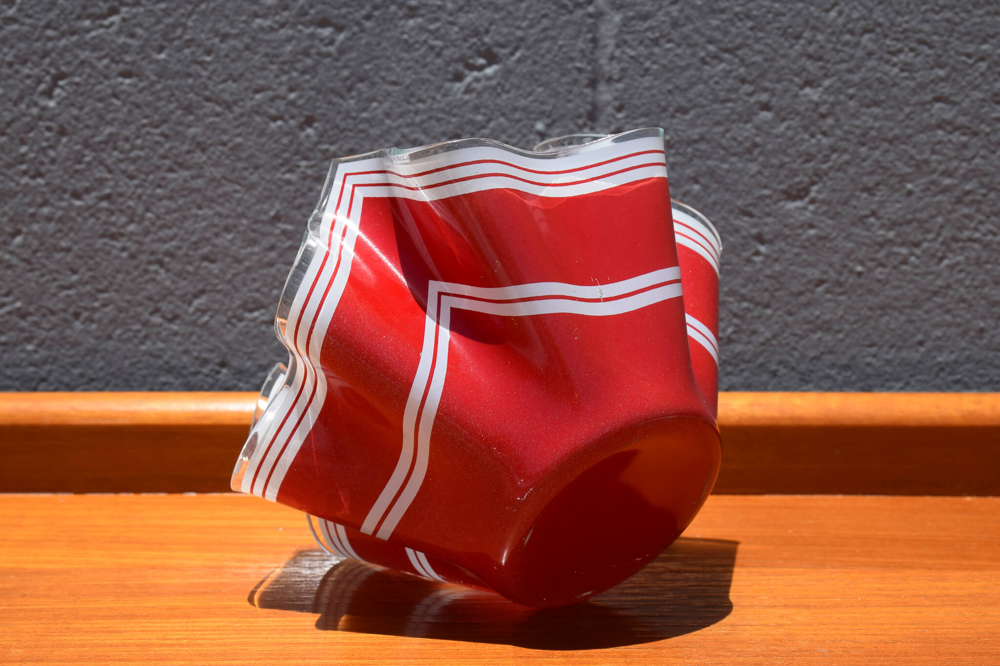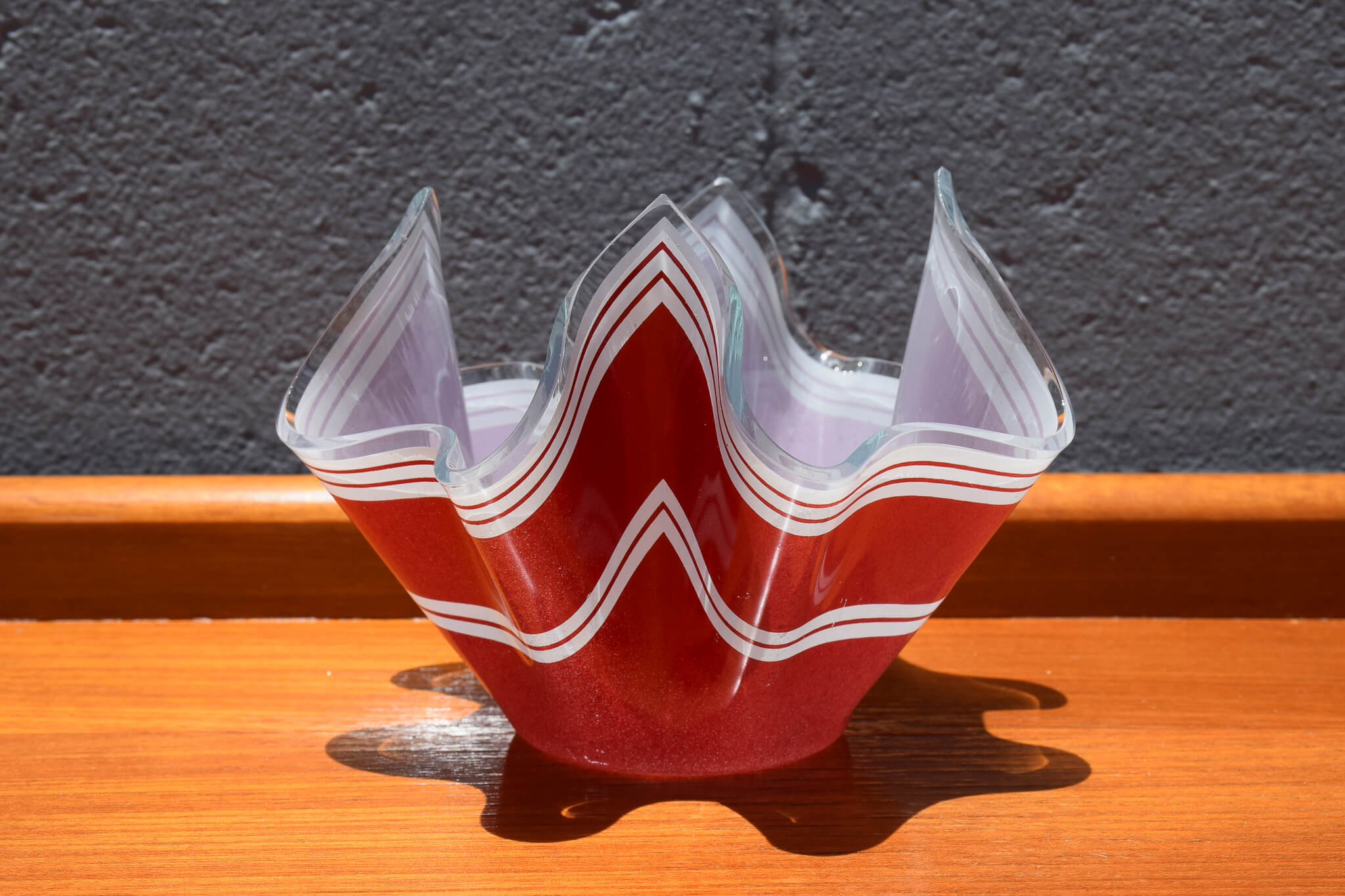 This stunning petite red handkerchief style bowl in a bold red design with white stripe would make a stunning addition to any home decor.