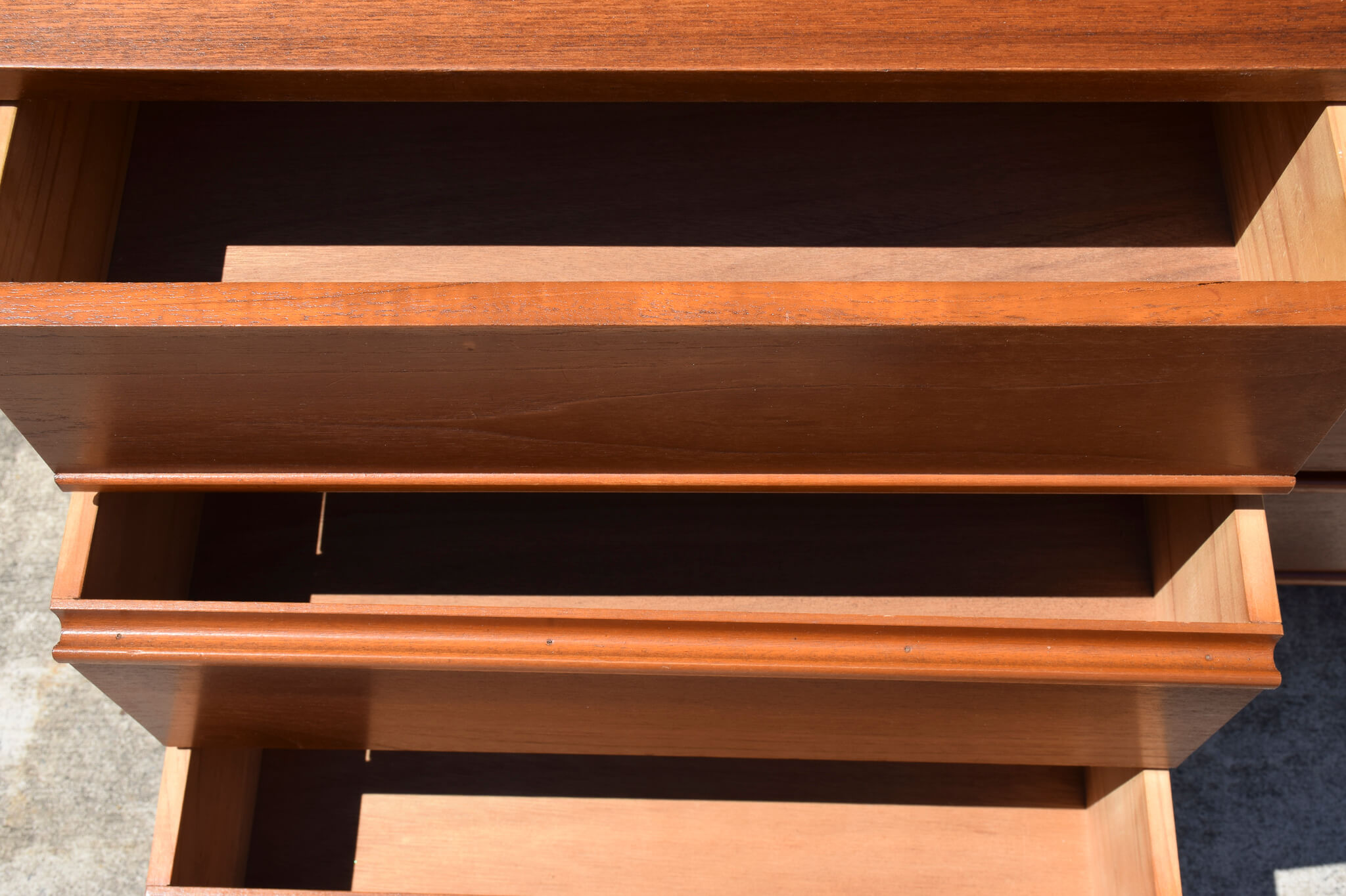 In great overall condition, there are a couple of repaired holes and fading where a bedhead was fitted on one side of each bedside. There is also slight wear to the back corner on the top of one of the bedsides. All drawers slide well and would sit beautifully in any bedroom space.