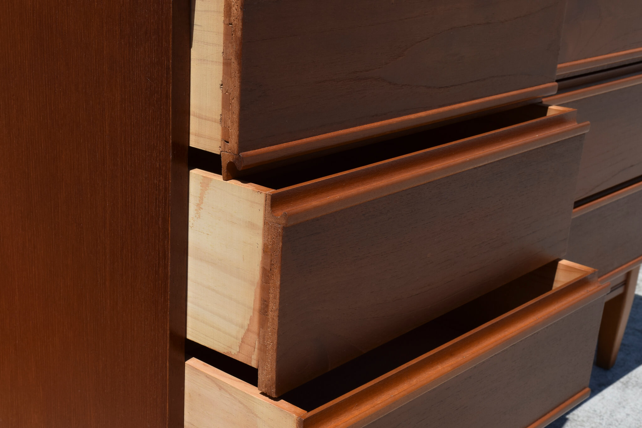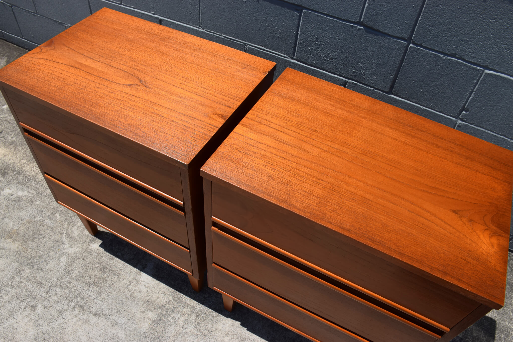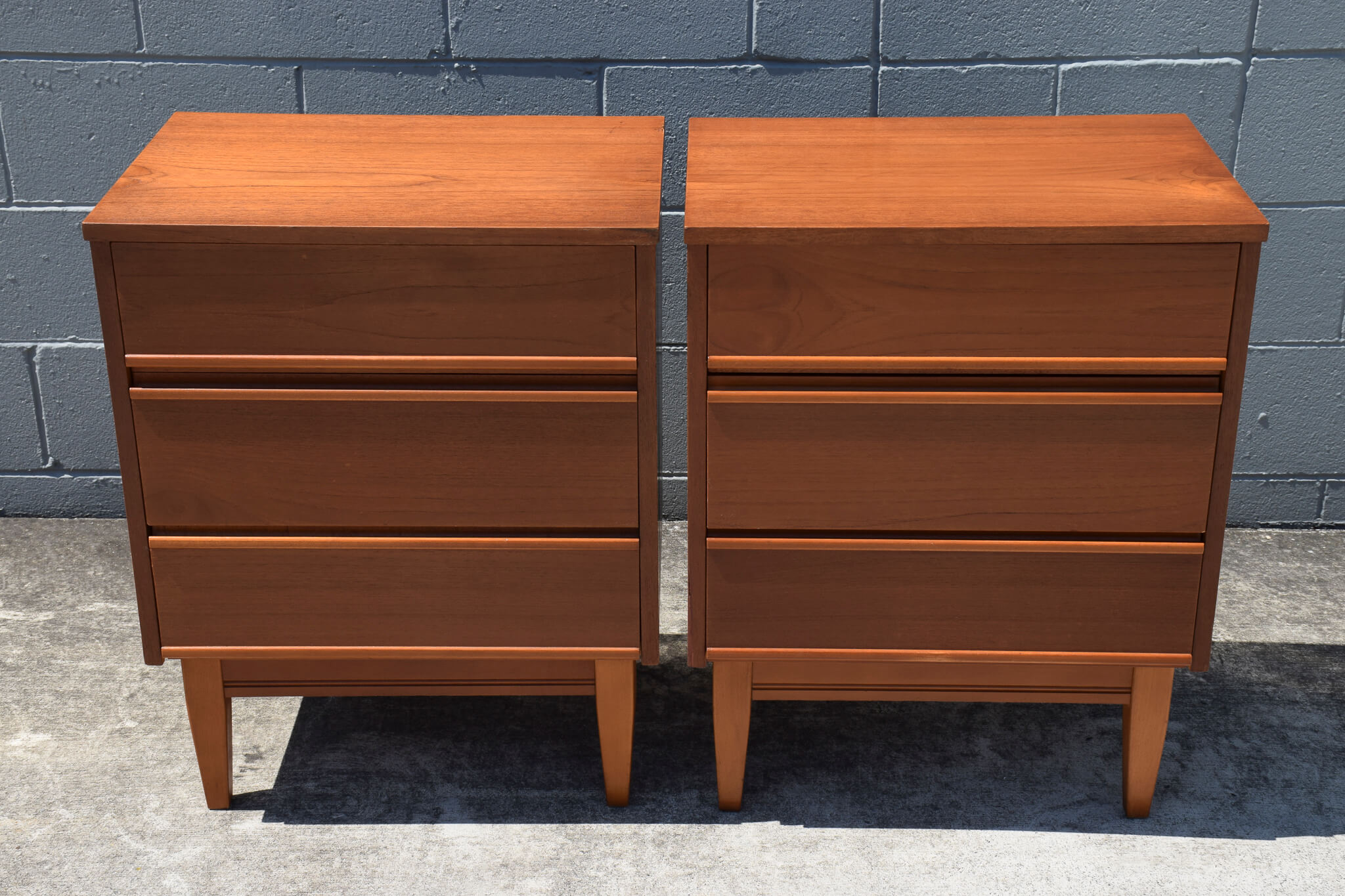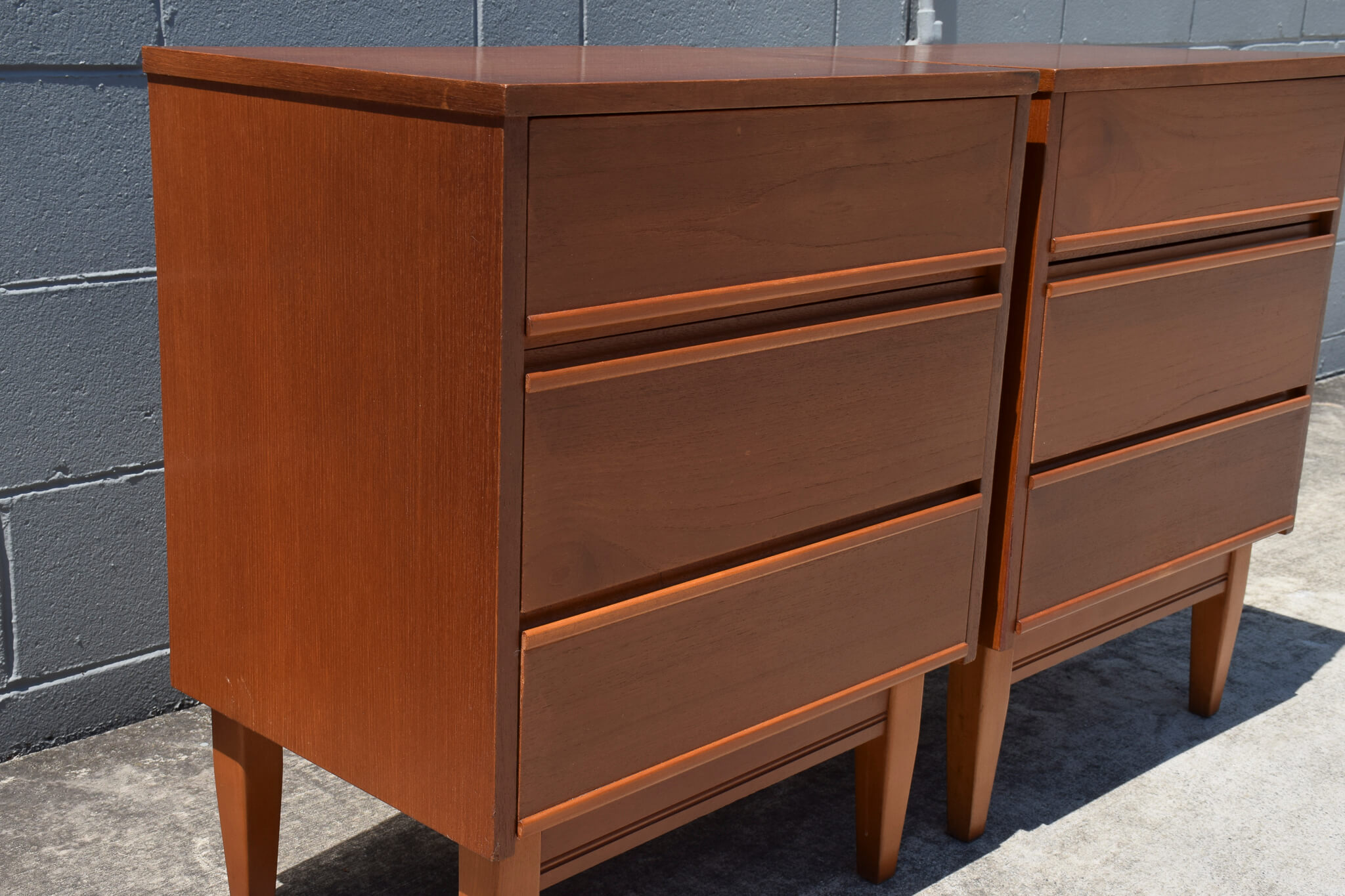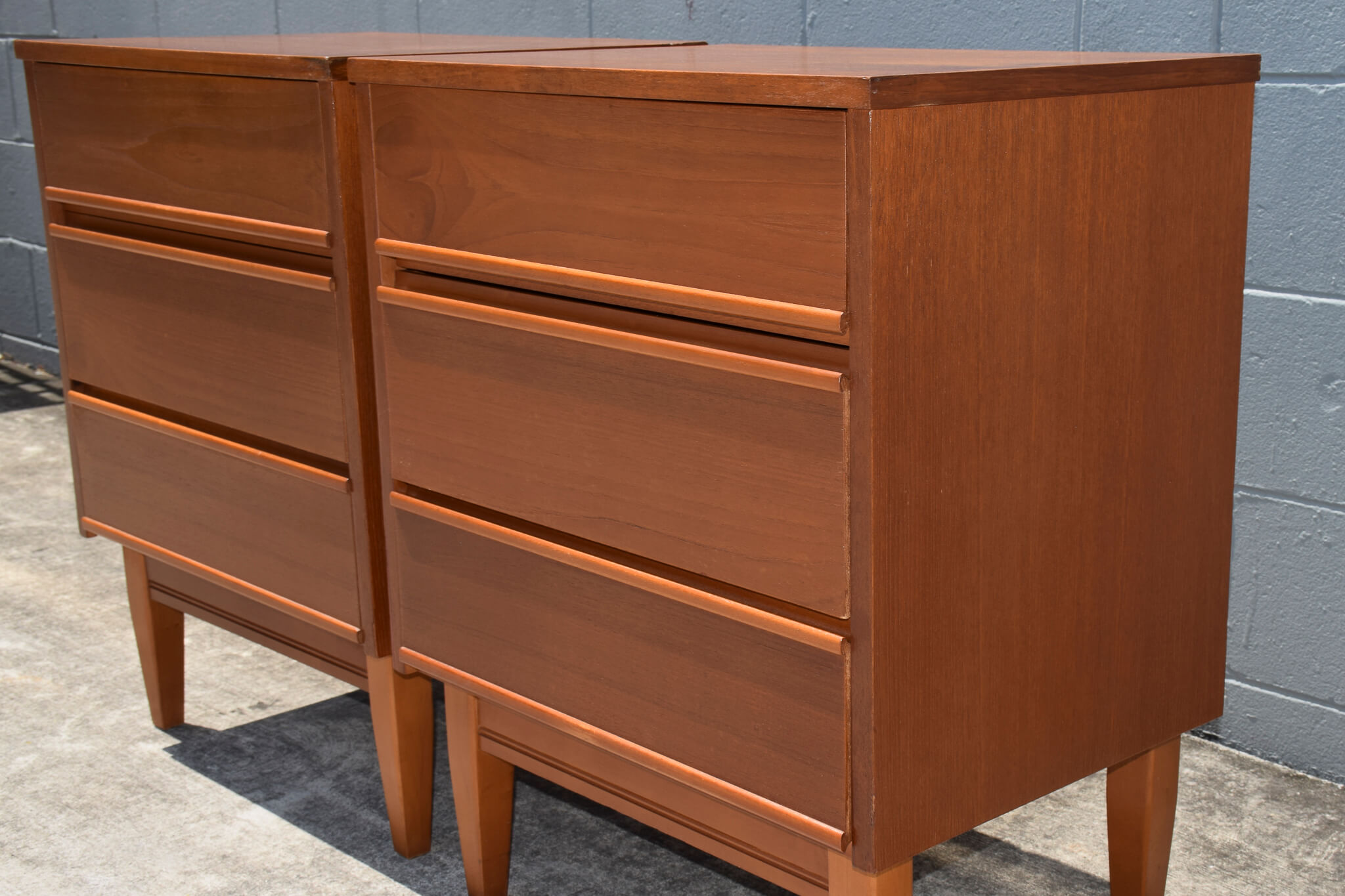 A pair of super rare Reliance Furniture bedside tables featuring a beautiful handle design and three generous sized drawers. Larger than your usual mid century drawers.