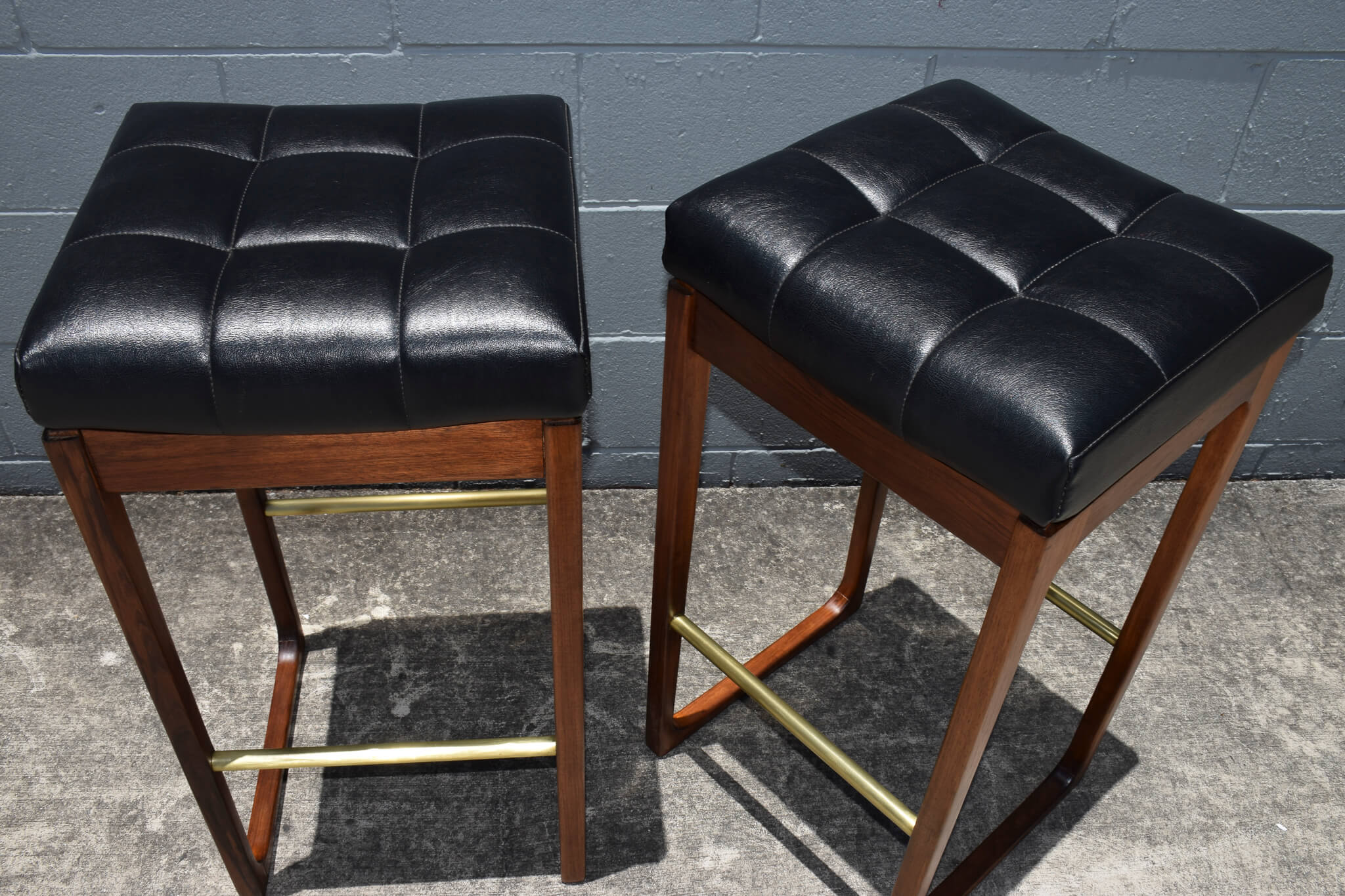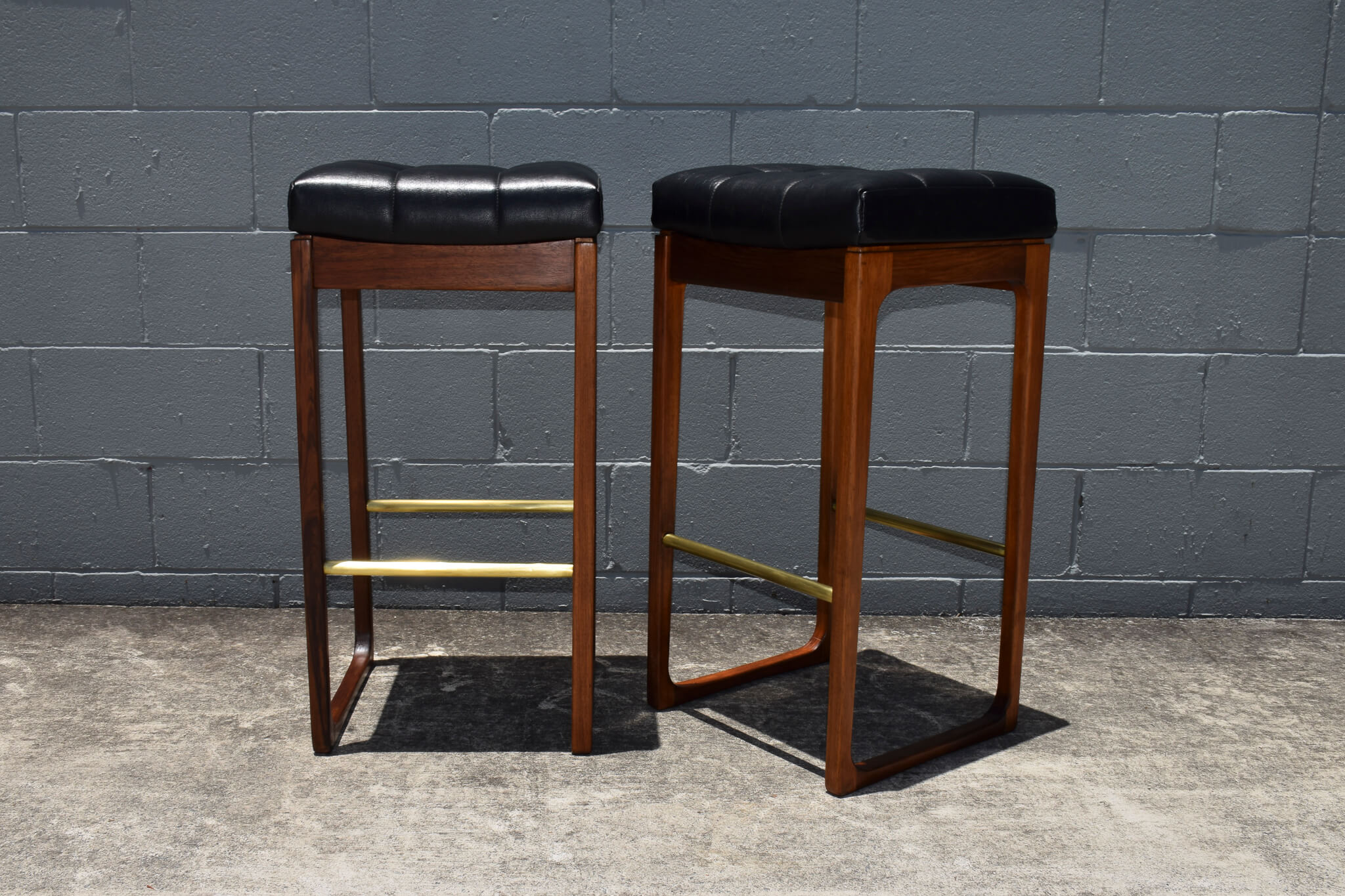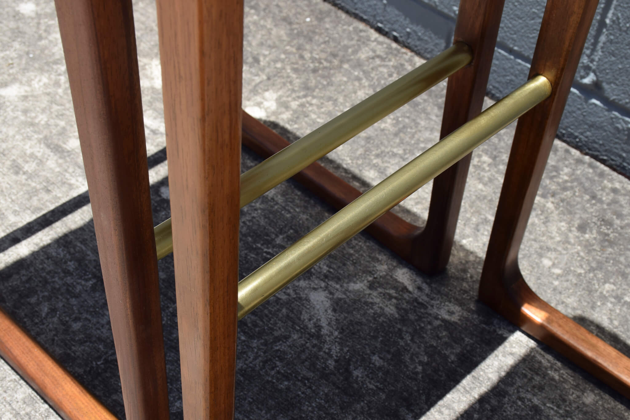 Stunning sleigh leg bar stools by renowned furniture designer Gerald Easden. Fully restored timber frames and brass footrests. Upholstery was recently completed and in great condition.