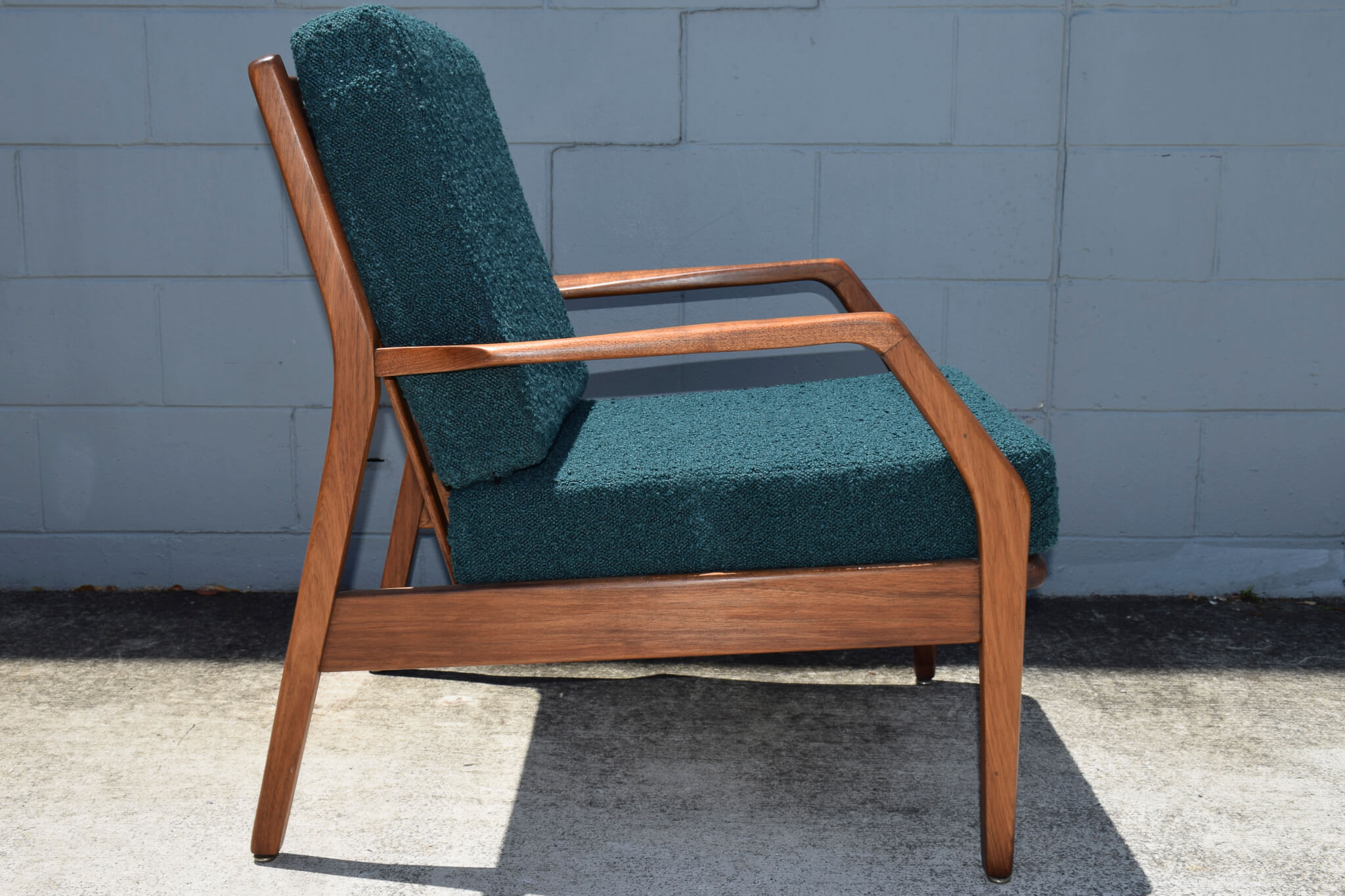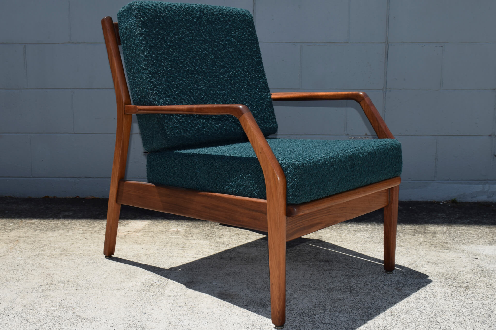 Timber frame is in lovely condition – has been cleaned, joints checked and finished in Danish oil. Fresh foam and upholstery using Warwick Fabrics ‘Ovis Spruce’ fabric.